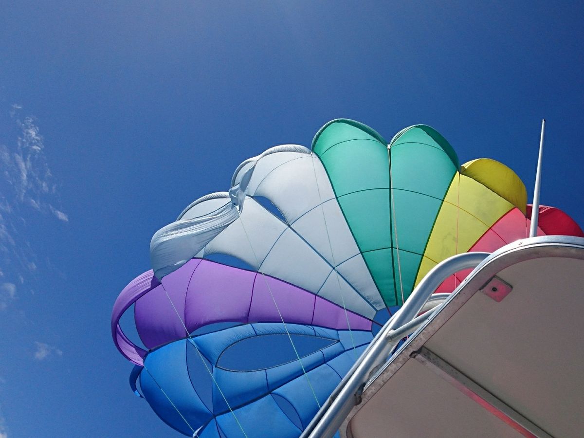 昔ハワイでパラセイリングを体験した時は、2人、前後ろに座るものだったのですが、最近のパラセイリングは横並びが主流のようですね。