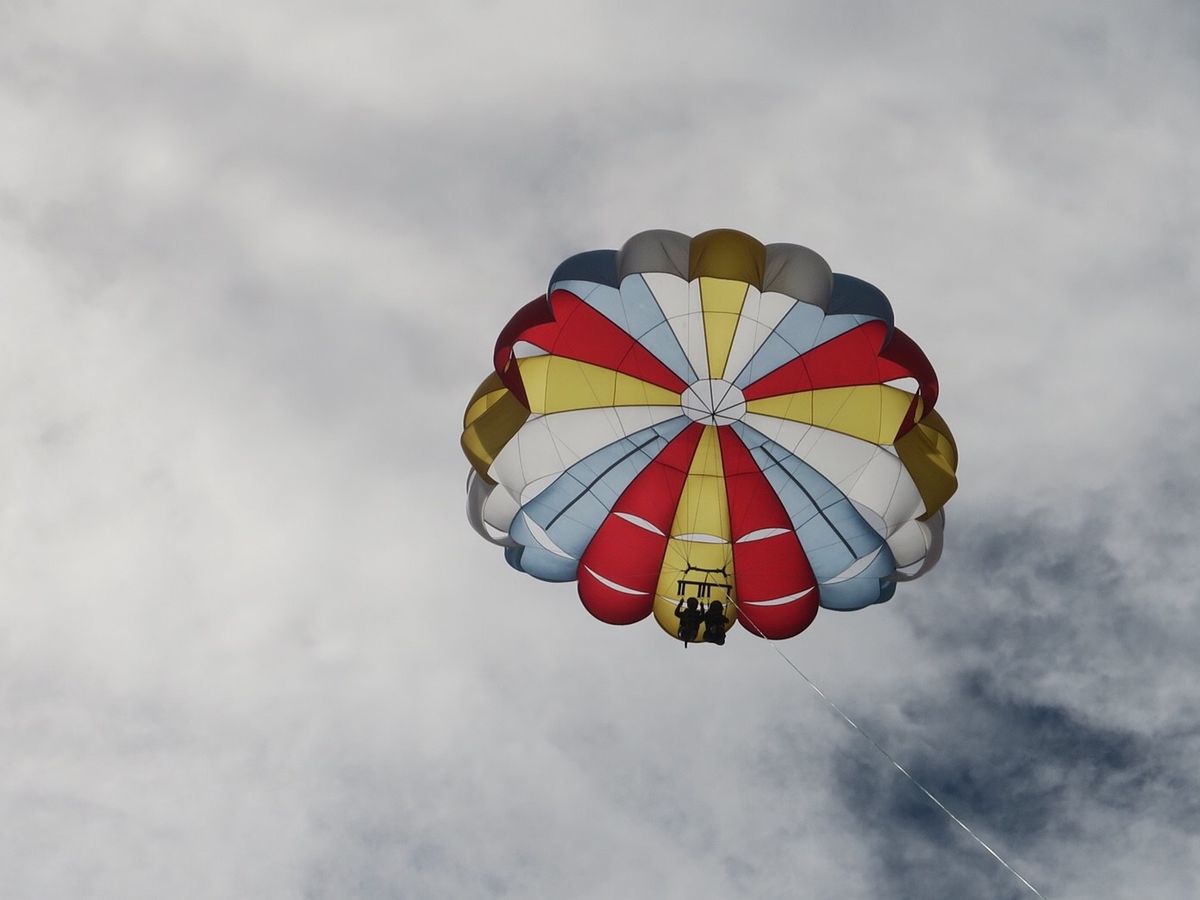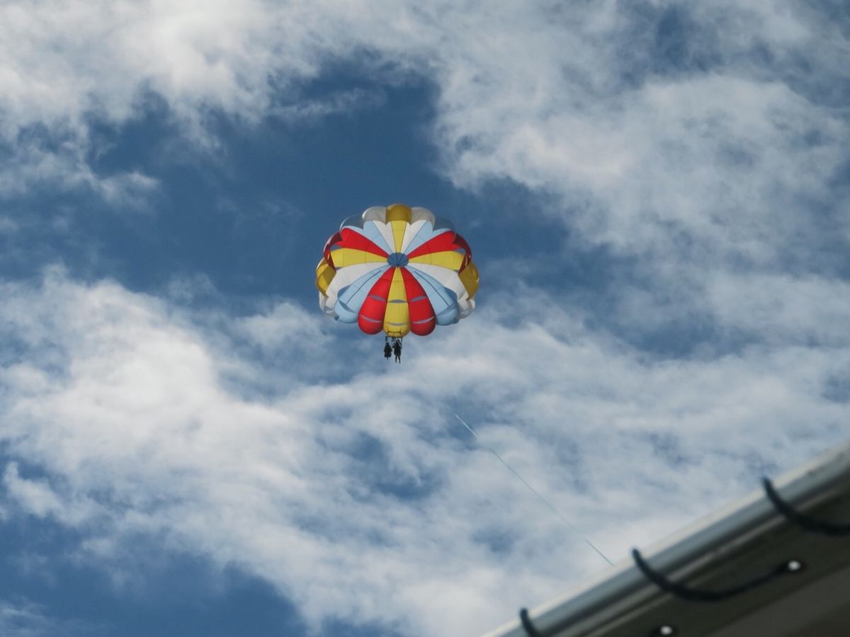 12月下旬に友達4人で参加しました。「怖いから私見てるわ」と言いです仲間も。と言いながらも船で沖合へ、係員から有無を言わさずライフジャケットを着てと・・・「ここに足を入れて座って・・・」恐れている暇はなく空中へふーわと。眼下のボートはだんだん小さくなって 怖さは全くなく躊躇した自分がバカみたい、皆 厚労省の人口分類では65歳以上の高齢者に入るのですがこの歳で初体験 異口同音にこんなに楽しめるなんて・・・