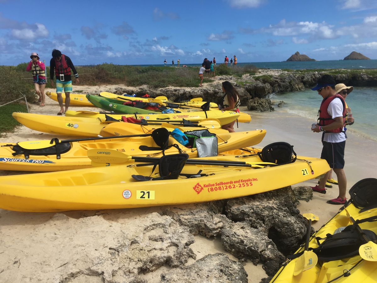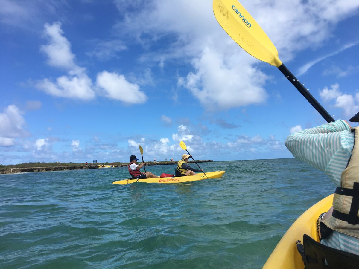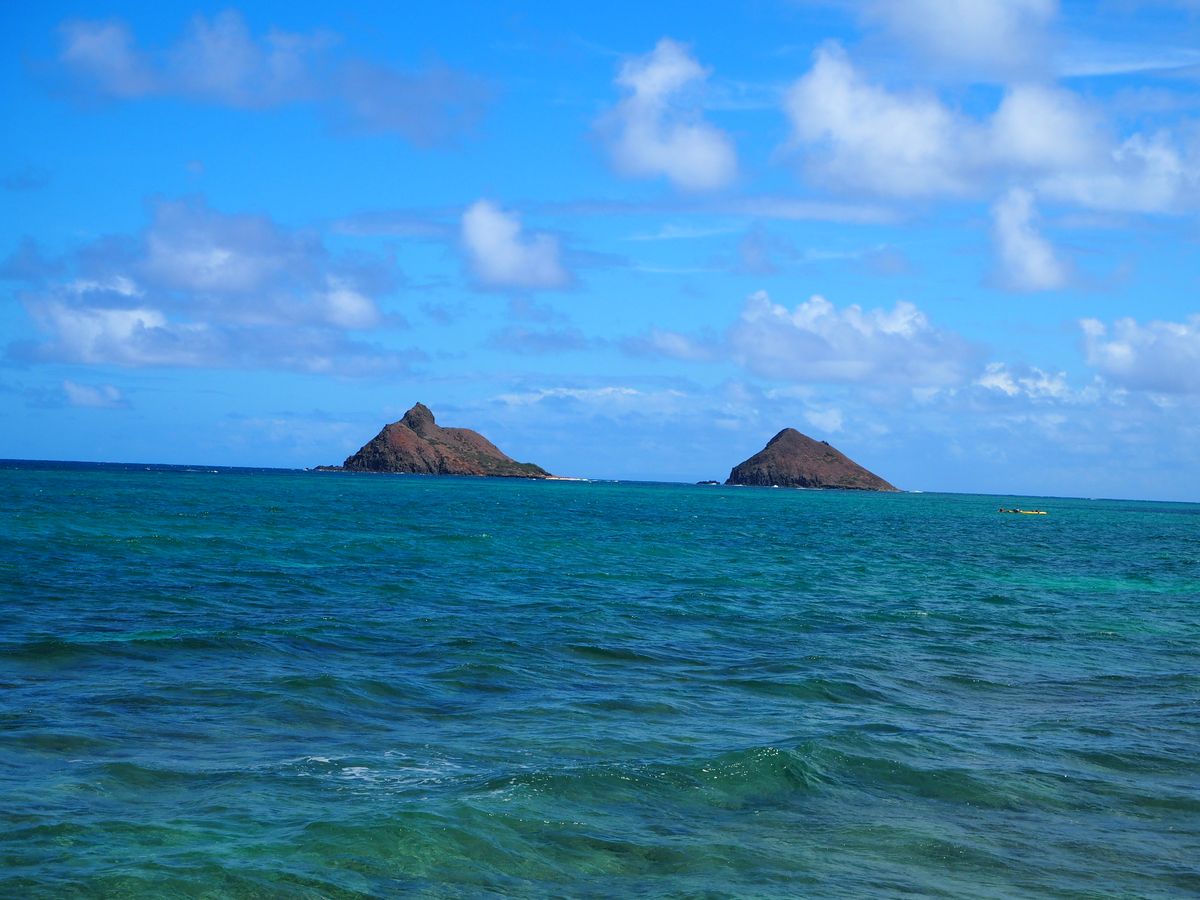カイルアビーチから約500メートル沖合にあるポポイア島まで二人乗りシーカヤックで漕いでいきます。今回は、我々夫婦を含めて3組6名。行きは横波の影響もあり、少し時間がかかりましたが、ガイドさんの誘導(途中で2回程度の休憩を入れ、みんなに声をかけ続け)が素晴らしく、シーカヤック初挑戦の我々でも気持ちよく楽しむことができました。ポポイア島は鳥の聖域で、ひな鳥、たまご、たまごを温めている親鳥に加えてウミガメも見ることができました。また、海側から見るラニカイビーチやその沖合の二つの島は、とても美しい。この日は、9時頃到着12時からシーカヤックのスケジュールでしたので、午前中はボディボードを借りてカイルアビーチに行きましたが、波に乗って砂浜まで一気に行けた時の気分は最高でした。これだけでも一日中遊んでいたいと思いました。ガイドの「ちはる」さんは、元気いっぱい笑顔いっぱいで楽しませてくれました。いろいろとアドバイスもしてくれたので、やはり、ガイド付のツアーにして良かったと思いました。ただ、この日はピザのお店が改修中でお休みだったのが残念でした。また、翌日以降の筋肉痛も良い思い出になりました。
