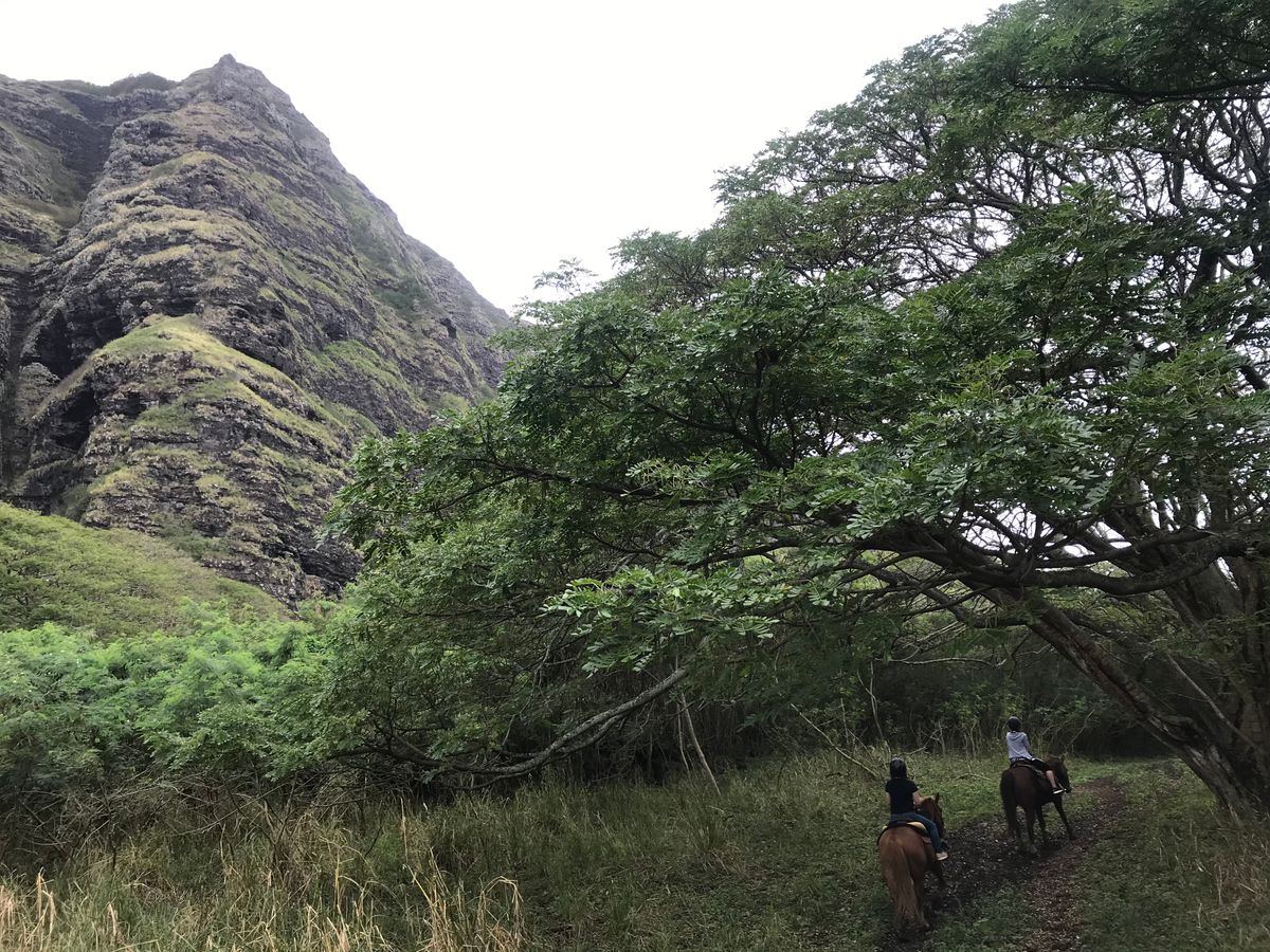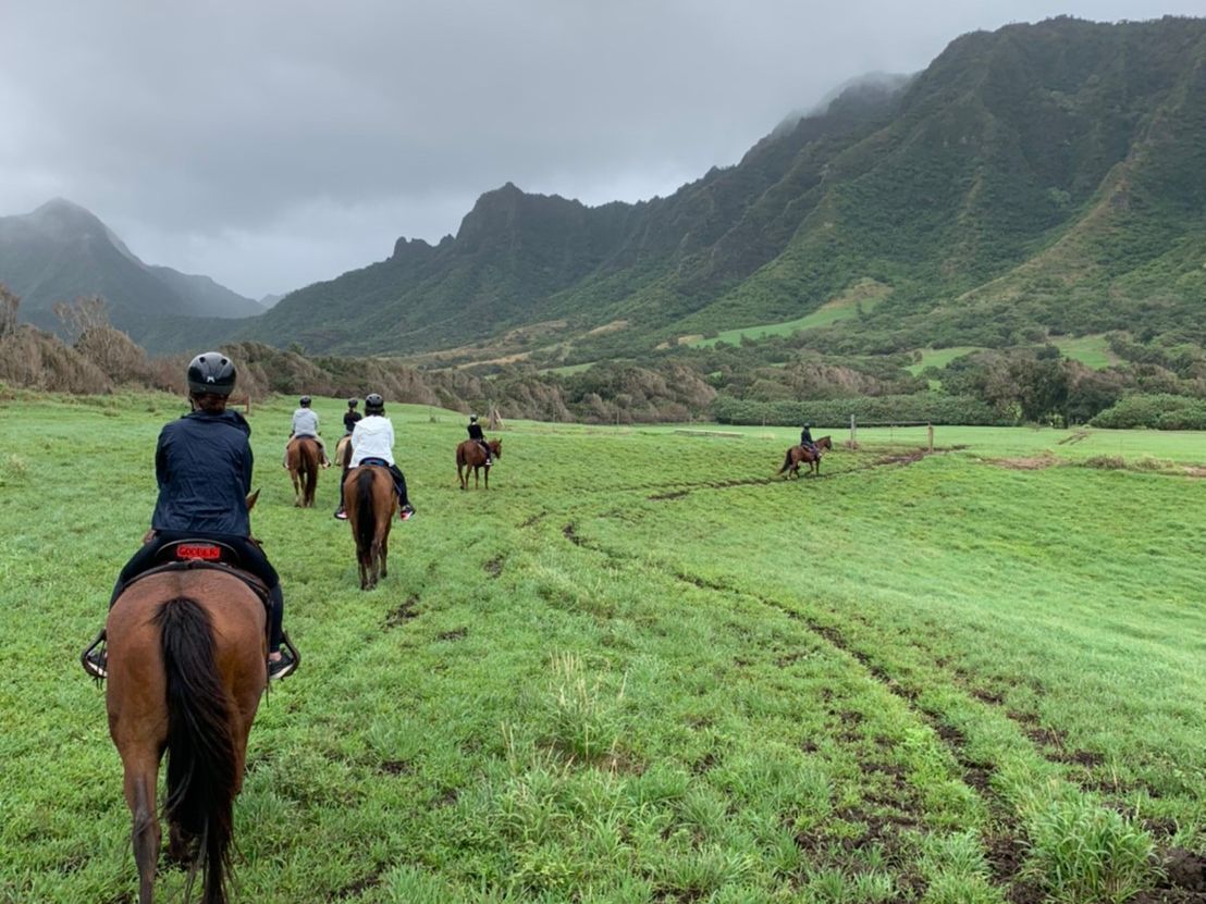 私は乗馬、農業ツアー、映画ロケ地ツアーを体験しました。乗馬の前に馬を見に行って、ふれあうことができました。クアロアの馬は人慣れしていて穏やかな馬が多いのではないかなと感じました。とてもかわいかったです。乗馬は初めてでしたが、最初に日本語の説明動画を見せてもらえました。実際に乗ってみると意外と揺れることに驚きました。また、手綱をコントロールすることが難しかったです。でも馬は賢く、きちんと1列になって歩いてくれました。母の乗った馬は少しせっかちなのか、前の馬との距離を詰めがちでインストラクターの方に”Space!”と何度か言われていましたが、私の乗った馬は適度に距離をあけながら歩いてくれました。しかし、”You’re still a driver.”というインストラクターの方の言葉が印象に残りました。ただ乗っているだけではだめで、きちんと馬をコントロールしなければならないのだなあと思いました。乗馬をしながらの景色もよく、とてもいい経験ができました。