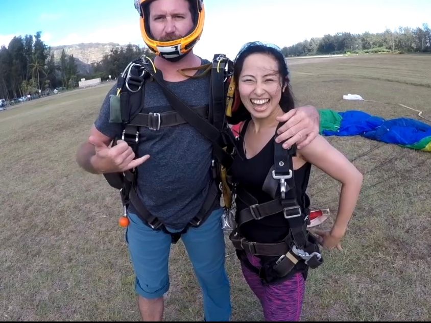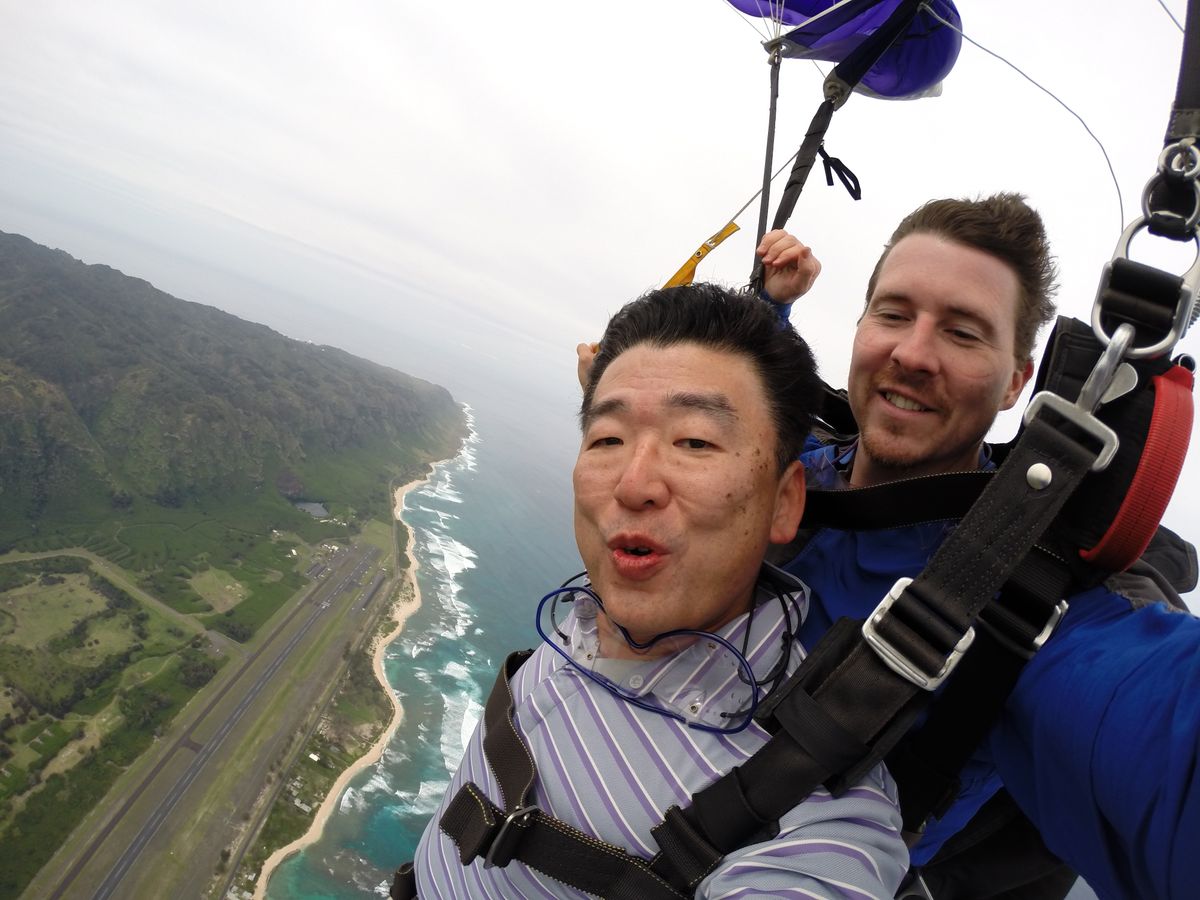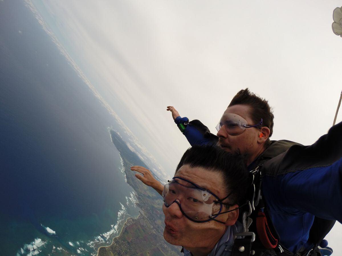 今までにあんな経験はしたことがなかったのですが、とにかく空を飛んでいることにびっくり。そして自分が下に落ちてる感覚が全くなくてその場で止まって飛んでいるような感覚です。パラシュートが開くまでは風圧がすごいですが、開いてからは落ち着いて景色を堪能することができました。