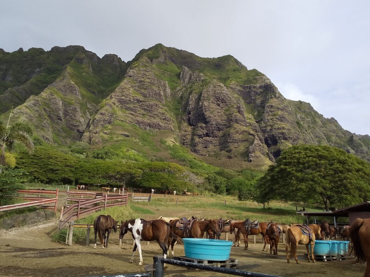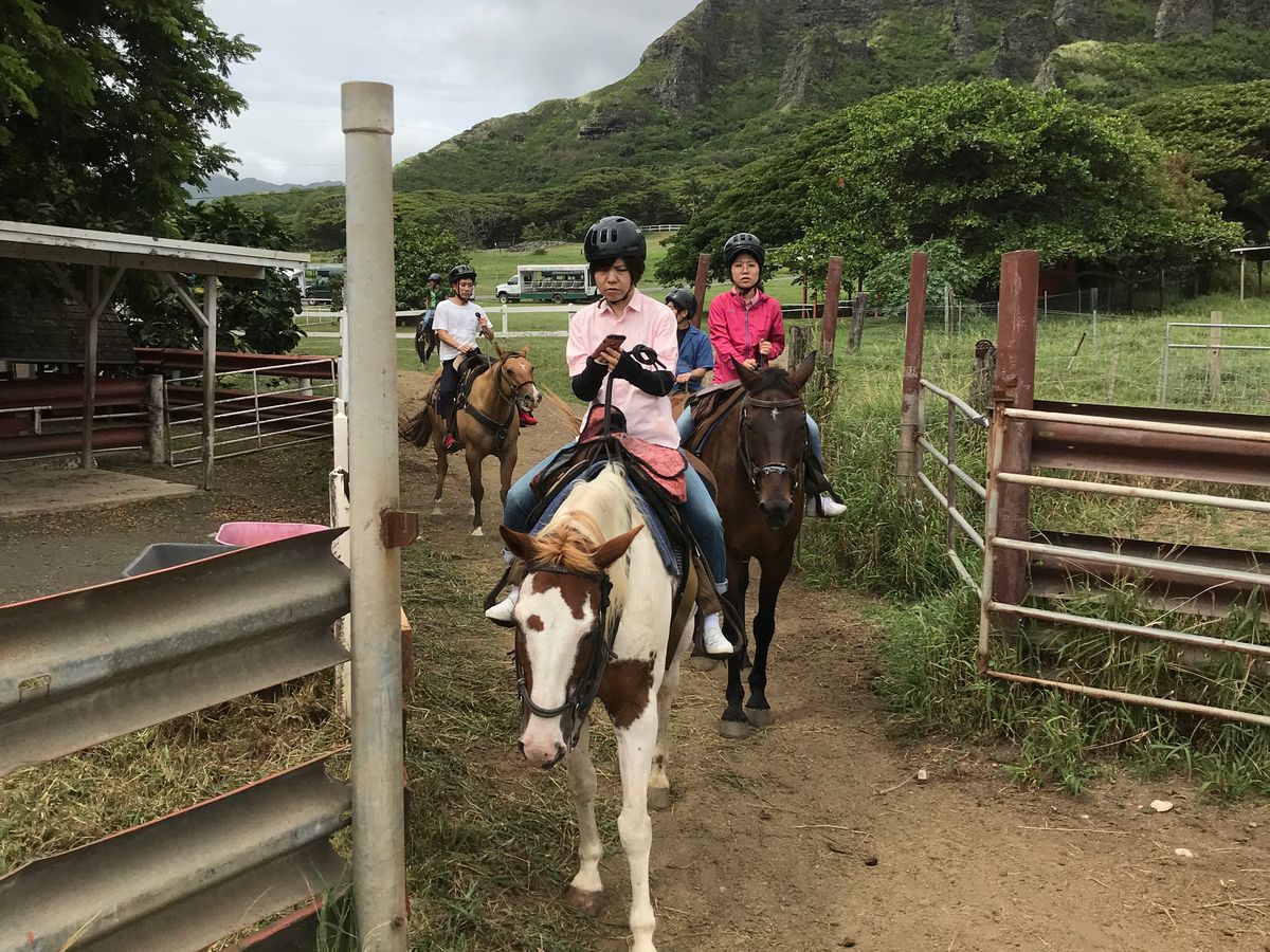 到着後、アクティビティの時間までは自由行動ですが、実はクアロア牧場の中って個人的に回れるエリアがないんです。入場すると各アクティビティのチェックインカウンターがあるのですが、その付近をうろうろするか、ご飯を食べるかしかないです。乗馬の時間まで2時間近くあったので持て余し、急遽現地で映画ロケツアーを申し込みました。(50ドルくらい。日本語のガイドさんでとても楽しかったです。)たまたまちょうどよい時間の空きがあったので良かったですが、そうじゃないと退屈かもしれません 。乗馬は、日本語のビデオを観たらいきなりスタートです。荷物は有料ロッカーへ、カメラはOKですが、両手を使う場面もあるので首から下げるほうが良いです。馬さんたちはよく調教されていてゆっくり回ってくれるので写真を取る余裕は初心者でもあると思います。景色がいいところもあるので是非。たまに道を外れる子もいましたが、ガイドさん(10人位の列に対して2人でした)が連れ戻したり、、、位はありましたが、自撮り棒で写真めっちゃ撮ってる女の子の乗ってた馬だったので手元がおろそかになってたんじゃないかと。たぶんちゃんと指示を出せば言うことは聞いてくれます。