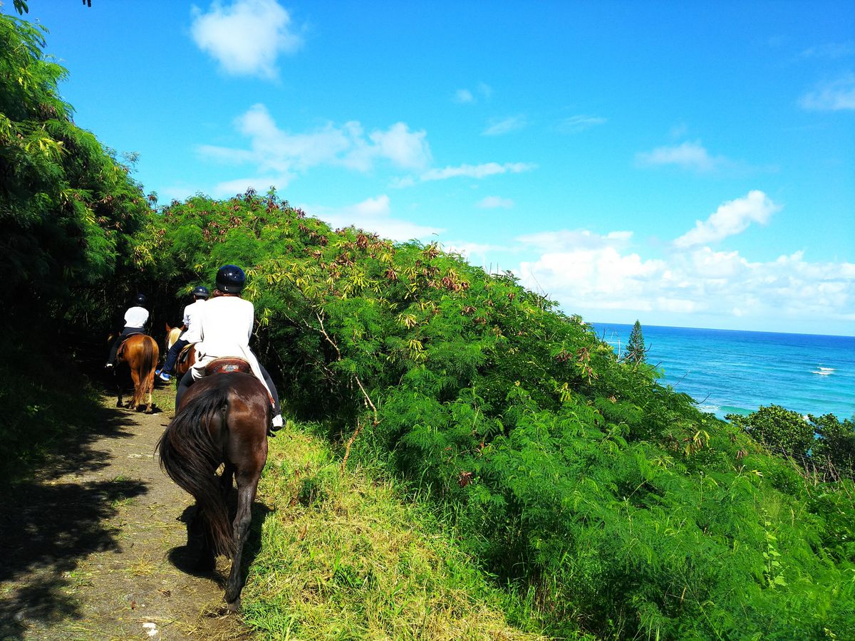 2時間コースに参加。久しぶりに馬に乗るというのに、事前のレクチャーは右に行きたいときは手綱を右に引き、左の時は左にということと、草などを馬が食べ始めたら、しっかりと手綱を引いて辞めさせるようにというものくらいででした。心配しながら馬に乗ったのだが、馬がとてもおりこうさんで、しっかり前の馬の後について進んでいってくれました。こんもりとした森の中を進んだかと思うと海が見える小径をいったり、ジュラシックパークの撮影地だったのでしょうか、大きな恐竜の骨がいくつも置いてある場所があったりで楽しめました。狭い道を向こうからも馬に乗った人たちが来て、すれ違えるのかとドキドキしたり、バギーが走っているのに出会ったり、2時間はあっという間でした。しかし、途中からお尻が痛くなったのは予想外でしたが、楽しむことができたツアーになりました。