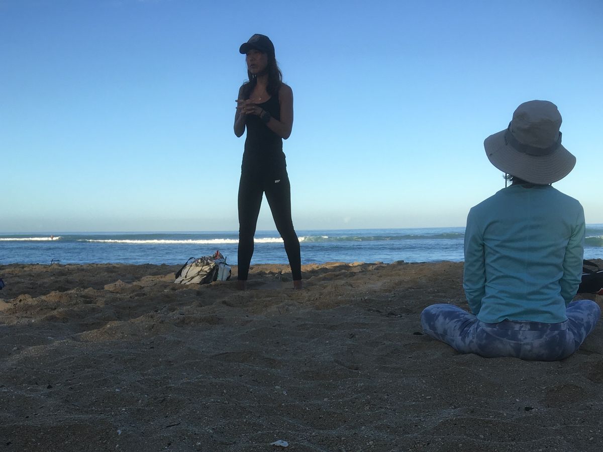 砂浜の上で裸足になり、インストラクターの方の指示を聞きながら、初めてのヨガを楽しみました。
