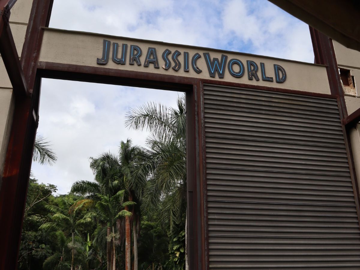 ジュラシックパークの看板前ではどのガイドさんも恐竜人形を持っていて、看板前に普通に立って撮るバージョンと、人形を前景にして襲われているようなポーズの2バージョンを撮ってくれます。