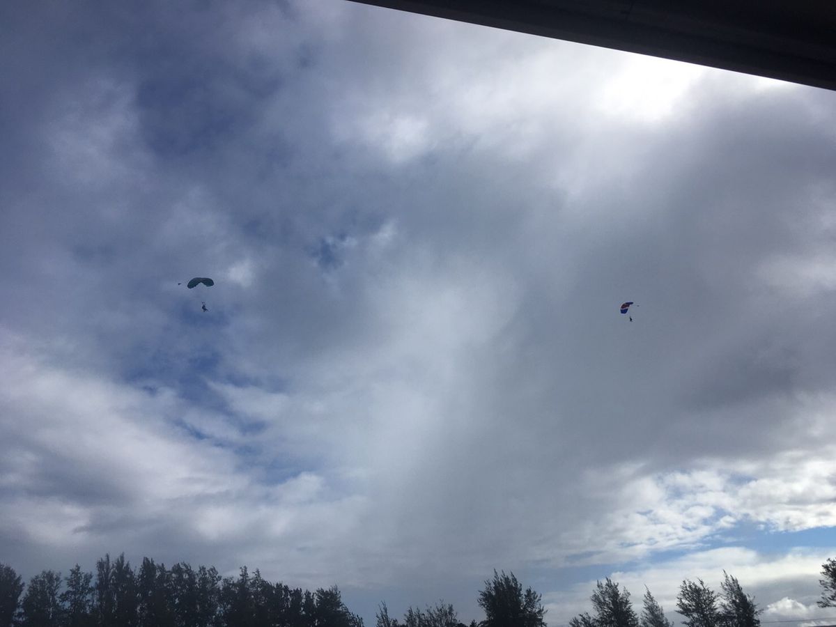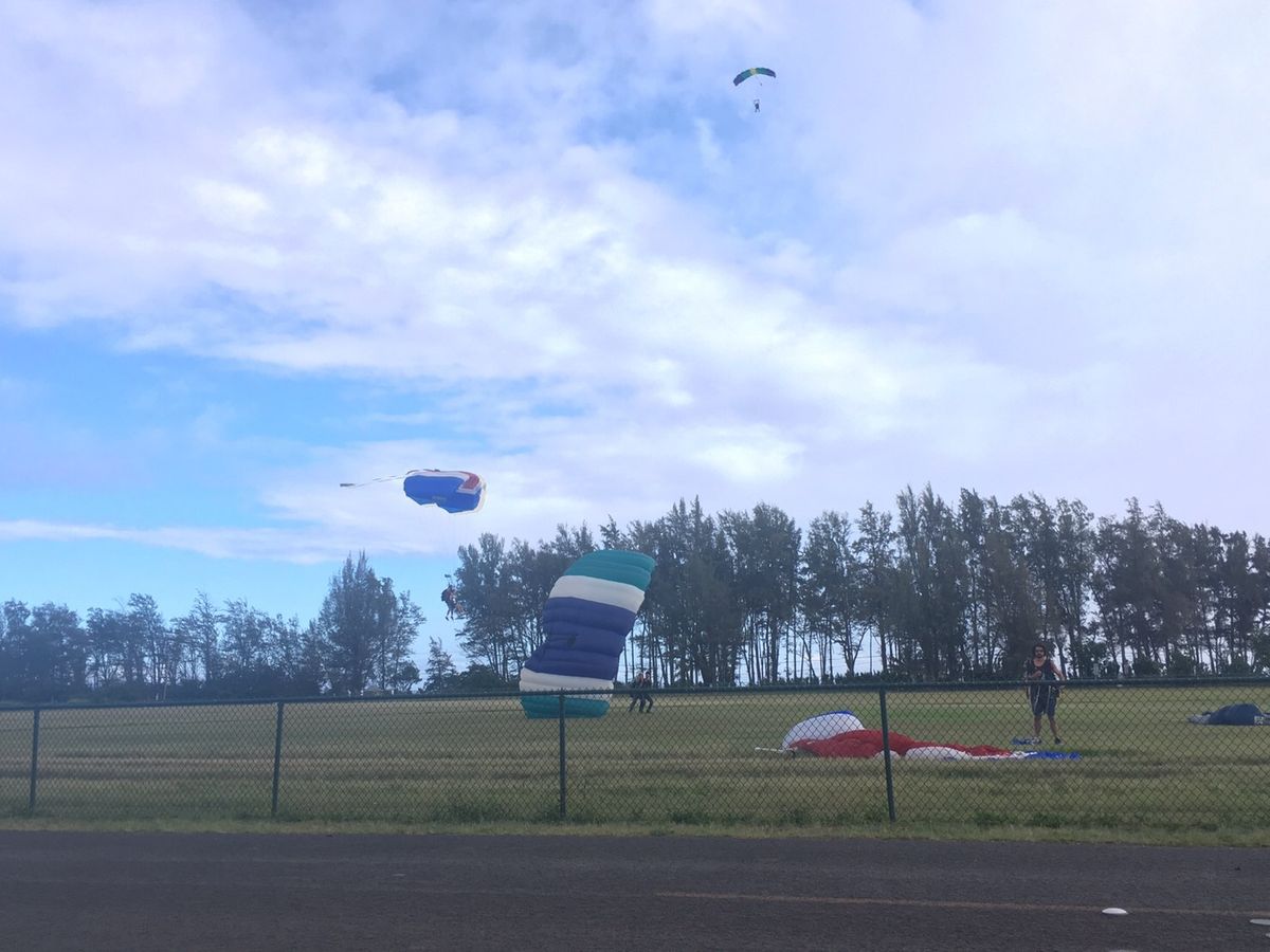 そしていよいよテイクオフ!10分ほどかけて高度4200メートルまで上がります。海がとっても綺麗でワイキキやダイヤモンドヘッドまで見渡せます!そこからはあっという間!ためらう間も無く順番に飛んで(落ちて?)行きます!フリーフォール中の感覚は今までにない感覚。ふわっと感はなくって冷たい風の中をくぐり抜けている感じ。恐怖感は不思議とない!それよりもパラシュートが開いてからの方が怖かった・・・5分ほど空中を飛んでから着陸。練習通りにできました!