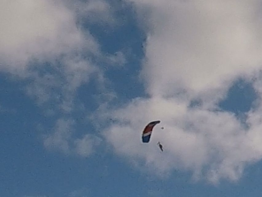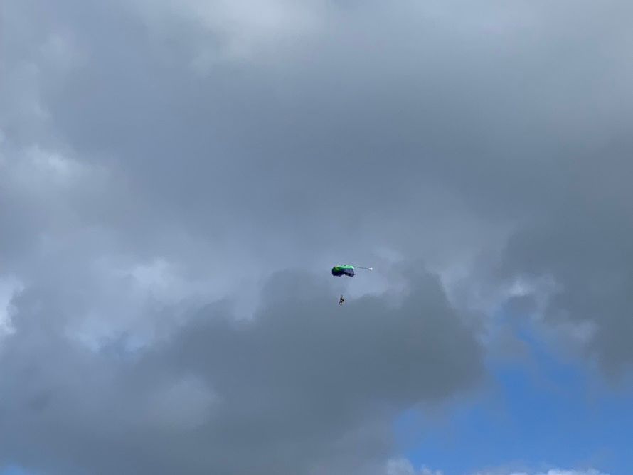 自由落下は風圧はすごいですが、手に空気を感じながら…景色も楽しめました。パラシュートが開いてからはゆっくり景色を楽しみながら飛行場目指して降りていきます。あの山がなんだ…この湾がなんだ…とガイドしてくれました。