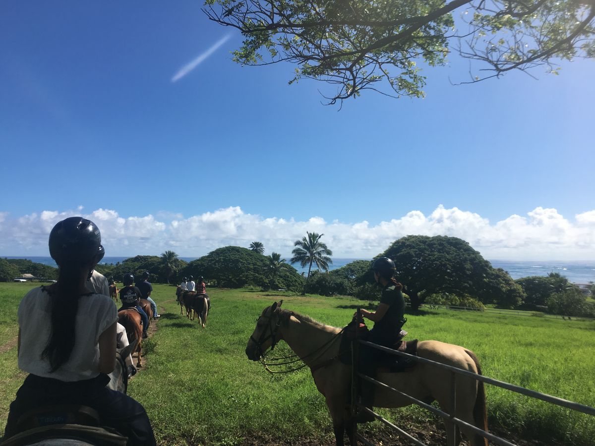 彼女との旅行で参加しました。大まかな流れは各地で参加者をピックアップ→ドールプランテーションで休憩→ハレイワで自由行動→乗馬体験でした。 ドールプランテーションではパイナップルのアイスが名物ですが甘くて美味しかったです。ハレイワ(写真)は雰囲気のいい場所で、新しくできたスヌーピーの限定ショップで買い物をしたり、ガーリックシュリンプが有名なお店でグルメを楽しむことができました。乗馬は未経験でしたが丁寧に乗り方を教えていただきました。馬はみな大人しく乗りやすかったと思います。景色を楽しみながら1時間以上も乗馬をできるのは貴重な経験でした。ガイドの方もとても親切で説明もわかりやすく、フレンドリーでした!大満足なツアーでした。
