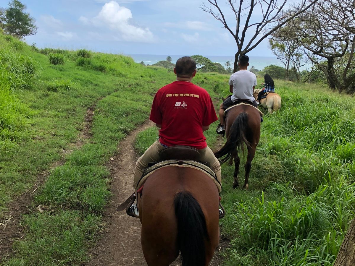 気の合うメンズ3人で現地インターネット予約。3人とも初めての乗馬でしたが、ハワイならではのサイコーに楽しい時間を過ごすことができました。受付から説明、何もかも英語オンリーです。その点オッケーならば全く問題ナシ。おすすめです。