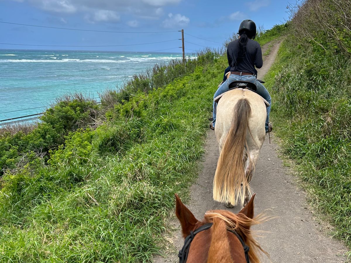 大型バスでクアロアランチまで向かいます。現地では日本人スタッフがいたため、現地の案内は日本語で聞くことができました。乗馬はヘルメットを着用します。持ち物は、スマホとお水とサングラスを、現地で渡される小さいポシェットに入れます(その他の荷物は、5ドル払って開け閉め自由のロッカーに入れます)。ただ、スマホは首から提げていた方がすぐに撮れて便利です。簡単な注意事項のビデオを見た後、すぐに乗り込みました。最初からガイドなしで乗るため、序盤は緊張しますが、馬がルートを熟知しているので、すぐに慣れます。私達が乗った時間の回はたまたま他にお客さんがいなかったたため、私達とガイドさんのみで貸切状態でしたが、普通は2-3組一緒に体験するようです。私達の担当ガイドさんはツーショットを撮ってくれましたが、ガイドさんによってはそういったサービスをしてくれない方もいるようなので、ラッキーでした。乗馬終了後は、1時間くらい時間があったので、周辺施設や海を見ながら過ごしました(1時間あれば十分くらい)。総じて、楽しめました。