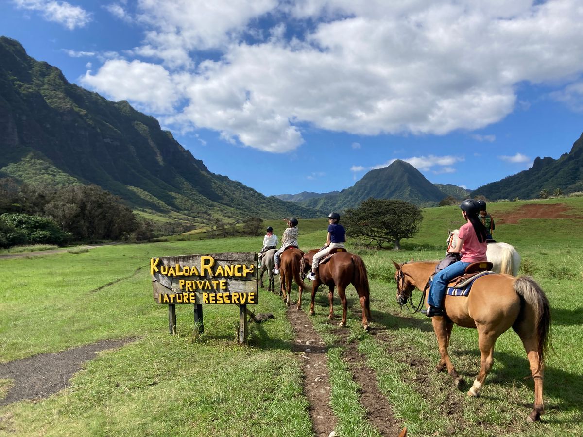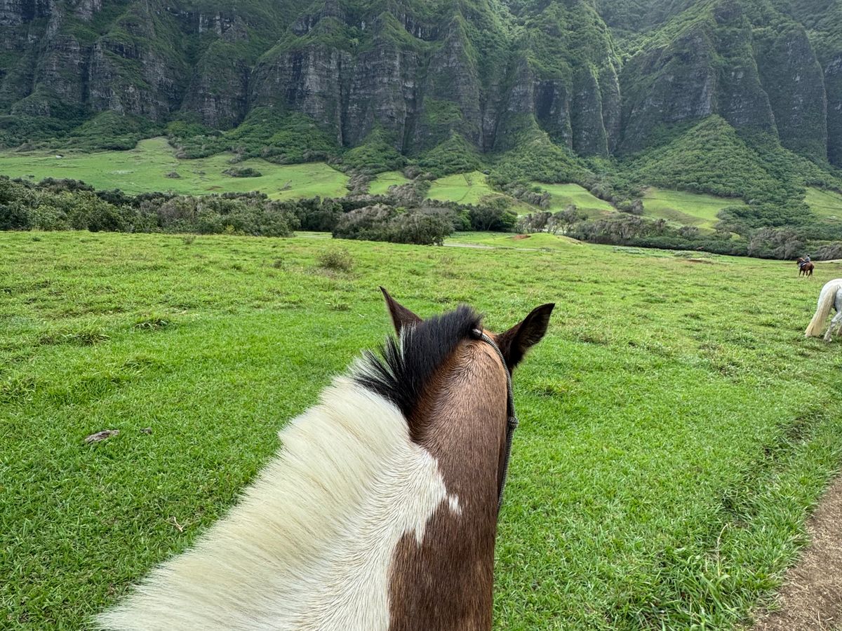 クアロアランチに来るのは2回目で、前回は映画ロケ地ツアーに参加しました。乗馬自体も初なのでドキドキでした。まず乗る時には長ズボンと靴、小さめのカバンなどはウェストポーチのように腰に巻きつけられるものでないといけないので注意。また馬が途中で草を食べたり、止まったりすることがあるので対処法を確認。乗馬は2時間たっぷりクアロアの自然や途中綺麗な海を眺めることもできて最高です。