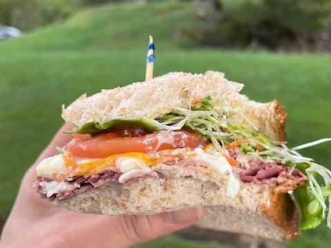 ランチは牧場の肉と果物・野菜を使ったハンバーガーがイチ押しですが、ボリュームがあるので、シェアした方が良いでしょう。なお、メニューは英語のみです。食欲がなく、さっぱりしたものが食べたい人にはアサイボウルもありました。また、飲み物として「お~いお茶」のペットポトルも販売していました。
