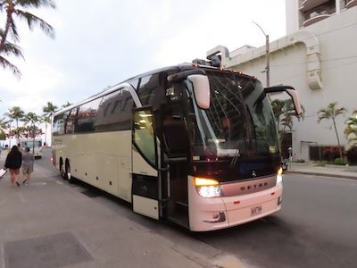 集合場所には大型バスが停車していましが、「クアロア・ランチ行」の表示が無かったので心配しました。しかし、スタッフがバスの乗降口で受付を始め、人が集まってきたので、わかりました。最初にメールで送られてきた「VOUCHER」を提示し、次に本人確認のため、パスポートの提示を求められました。