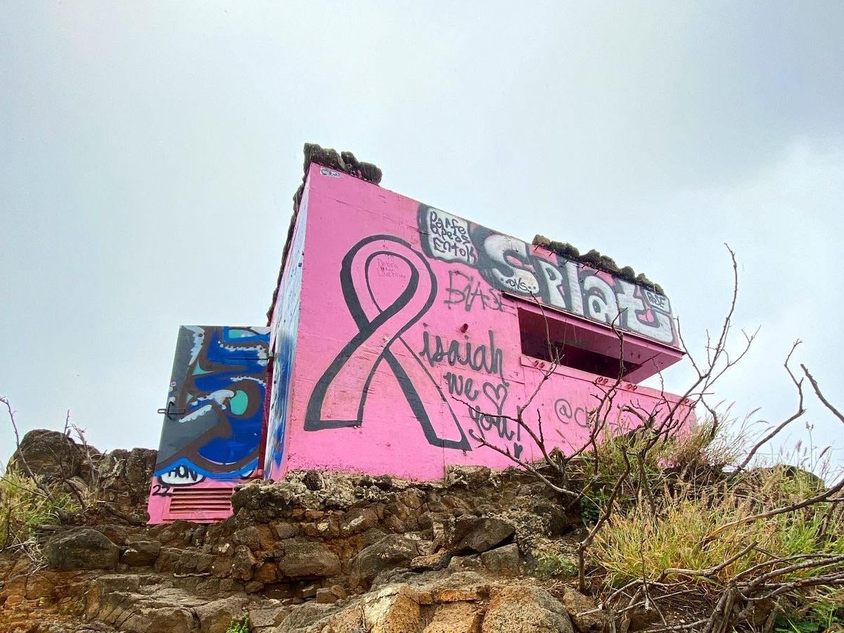 根の張っている道を進むこと45分、見晴らしのいい絶景の広がる場所へ辿り着くと、ピルボックスが見えてきました。こんなに登ってきたんだなぁと思うほどの、海の広がる見晴らしです。