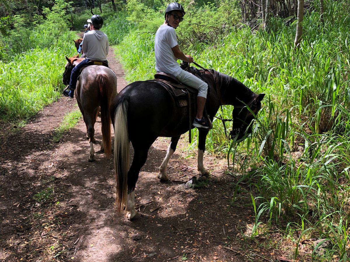 還暦を過ぎた夫婦で初の乗馬体験に参加しました。説明が英語でチンプンカンプン!(ビデオは日本語なのでOK)同じグループに日本人の方がいらして英語が堪能な方だったので助かりました。私が乗ったお馬さんがお利口でとても良かったです。主人のお馬さんは最初から最後まで何度も草を食べ立ち止まる事が多く手こずっていました。初めての体験でしたが、大自然の景色を見ながら楽しむ事ができ良い思い出ができました。