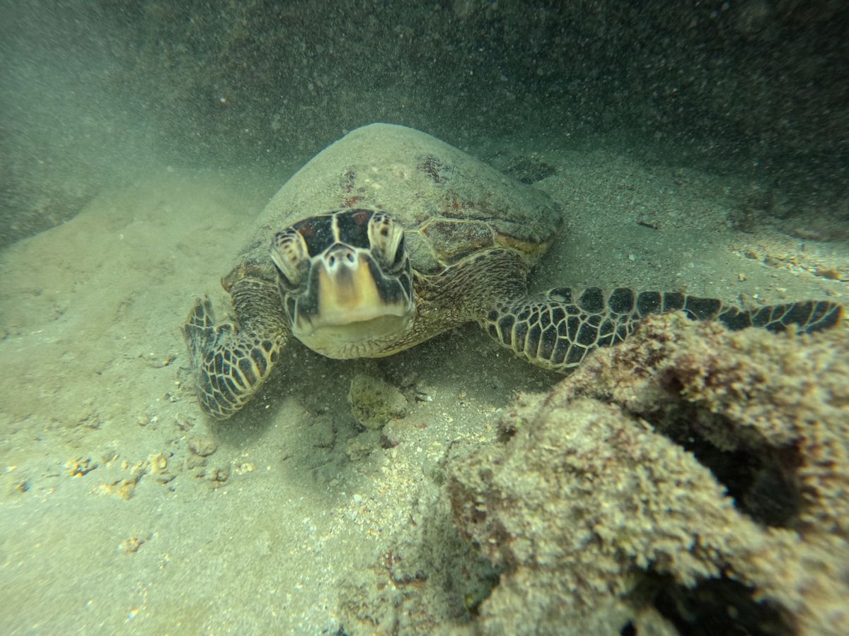 岩陰でお休み中のウミガメに会え、少しですが一緒に泳ぐことが出来ましたね!