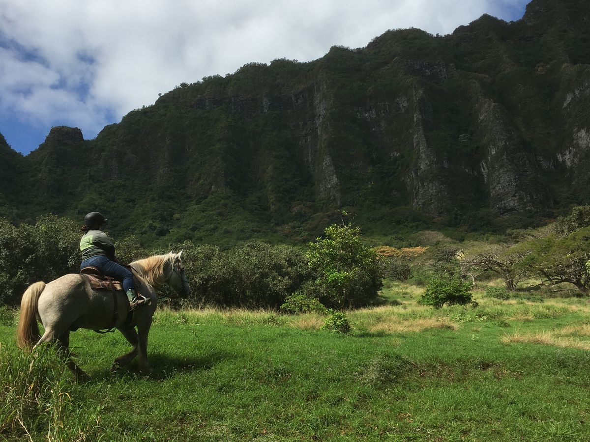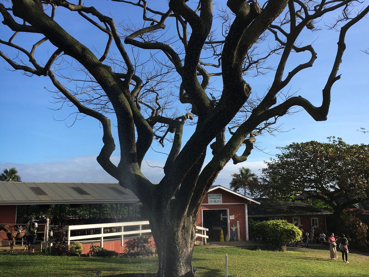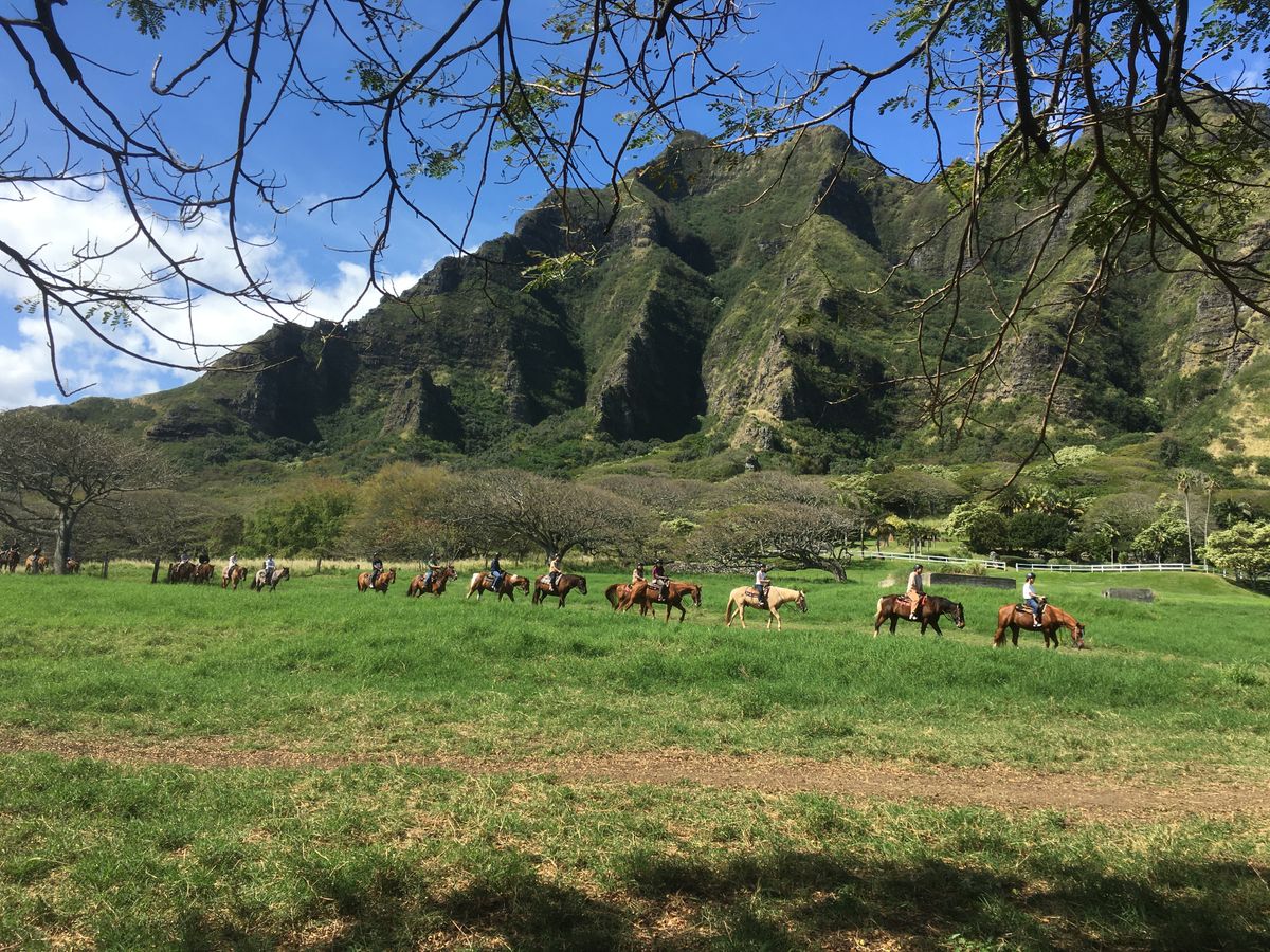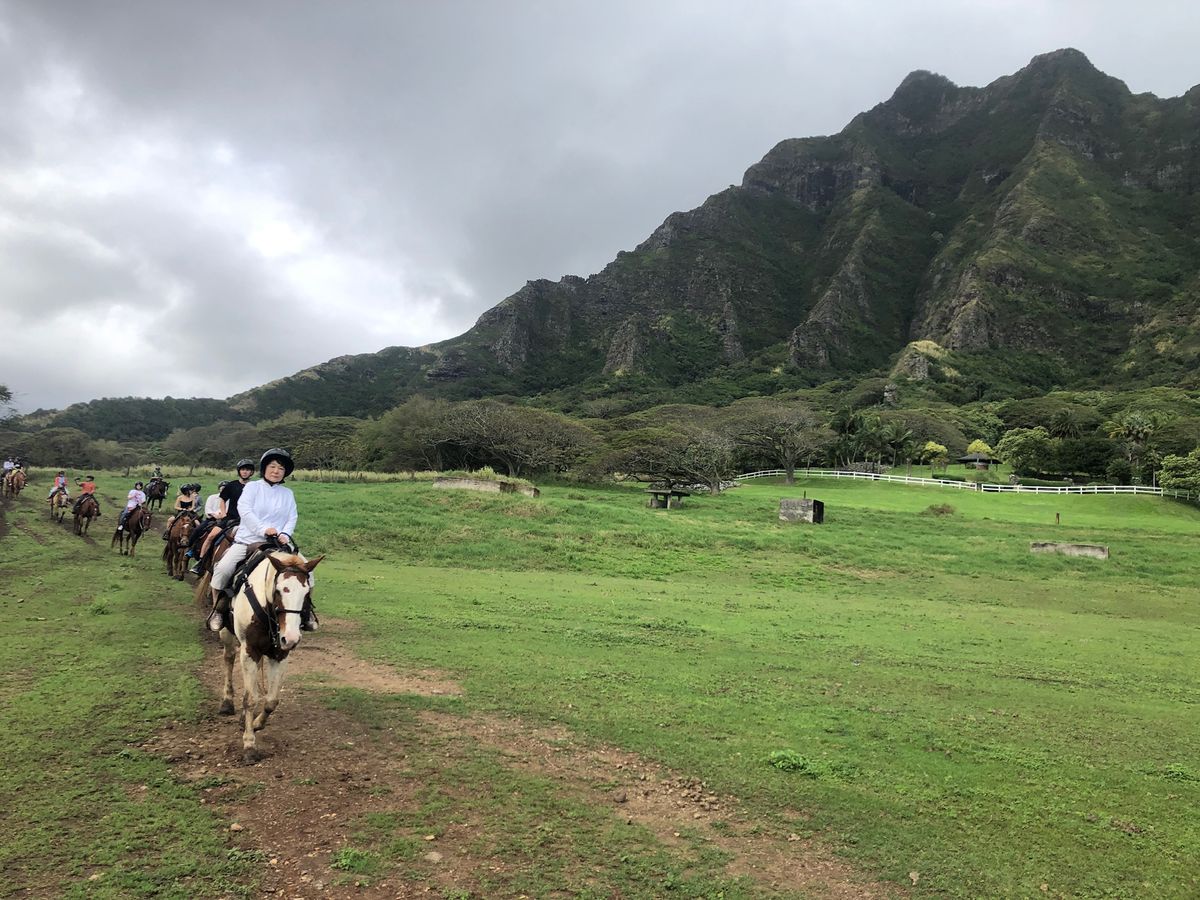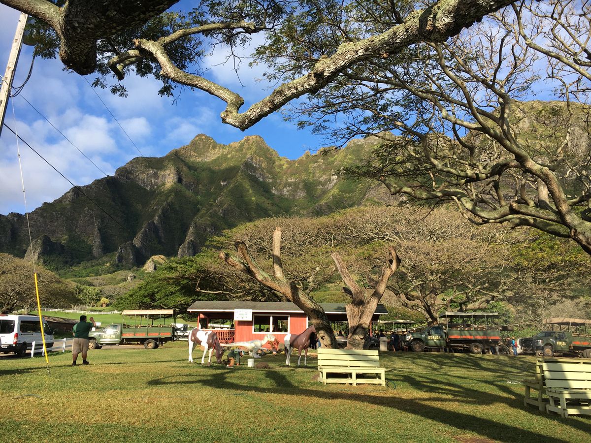 ピックアップ場所で受付後 本日のアクティビティの時間と順番を記入された紙と手首に 色の着いたテープ巻かれバスで移動 当日は参加者多かったのか バス2台でした。海岸沿いに走りながらノースショア方向へ 約70分 牧草地帯が 左に見えてきたら クアロアランチの看板が 牧草には 牛 牛 牛そして 馬に乗ったカーボーイが 期待一気に高まります。ゲストセンターの前でウクレレ演奏するスタッフに迎えられ 各アクティビティの集合場所の説明受ける。あとは各個人が 選んだコース参加します。食事は簡単なバイキング