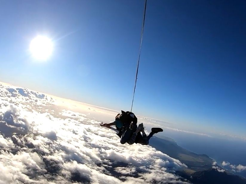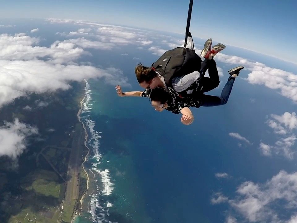 「1・2・3で飛ぶからね」と練習で聞いた通り、されるがままって感じで飛行機から飛び降りました。飛んでいる間は、自分で見ている景色が本物なのか?ってわからなくなるくらい素敵でした。天気が良かったので、海の色も青く澄んできれいでした。