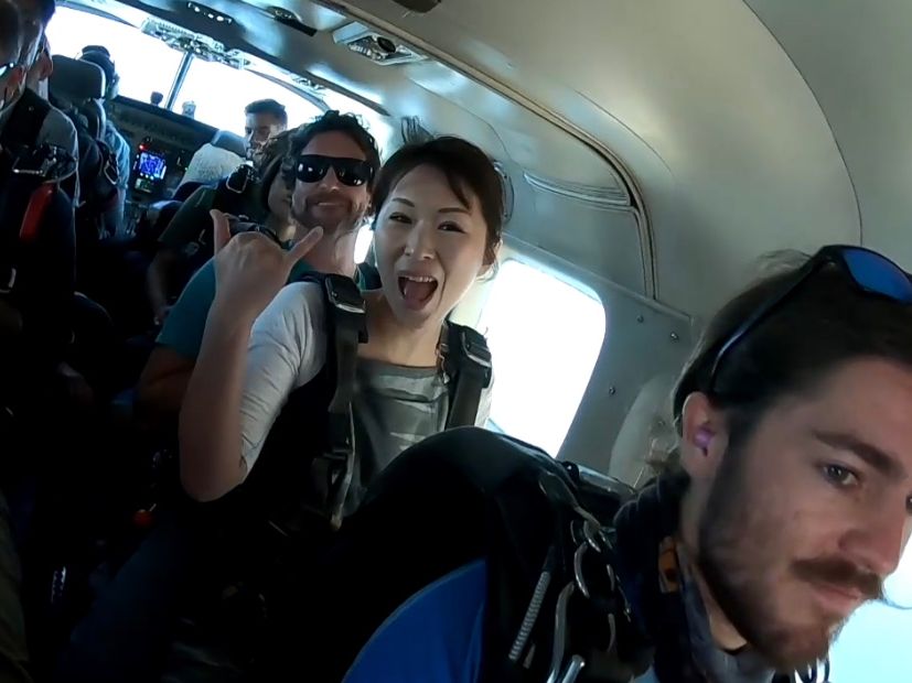 スカイダイビング初体験はかなり楽しかったです!!!インストラクターの方たちも、緊張をほぐすために、ずっと声をかけてくれたり、みんなとてもフランクな雰囲気でした。セスナに乗って、上はどんどん上がり、インストラクターとガッチリハーネスをつなぎます。もうこの辺から実感が。。怖いなーと思いながらも、セスナからの景色を楽しみました!そしてドアがopen。。