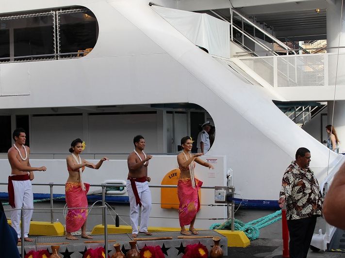 フラダンスでのお出迎え→船長との写真撮影・シャンパン→船内での食事という流れです。