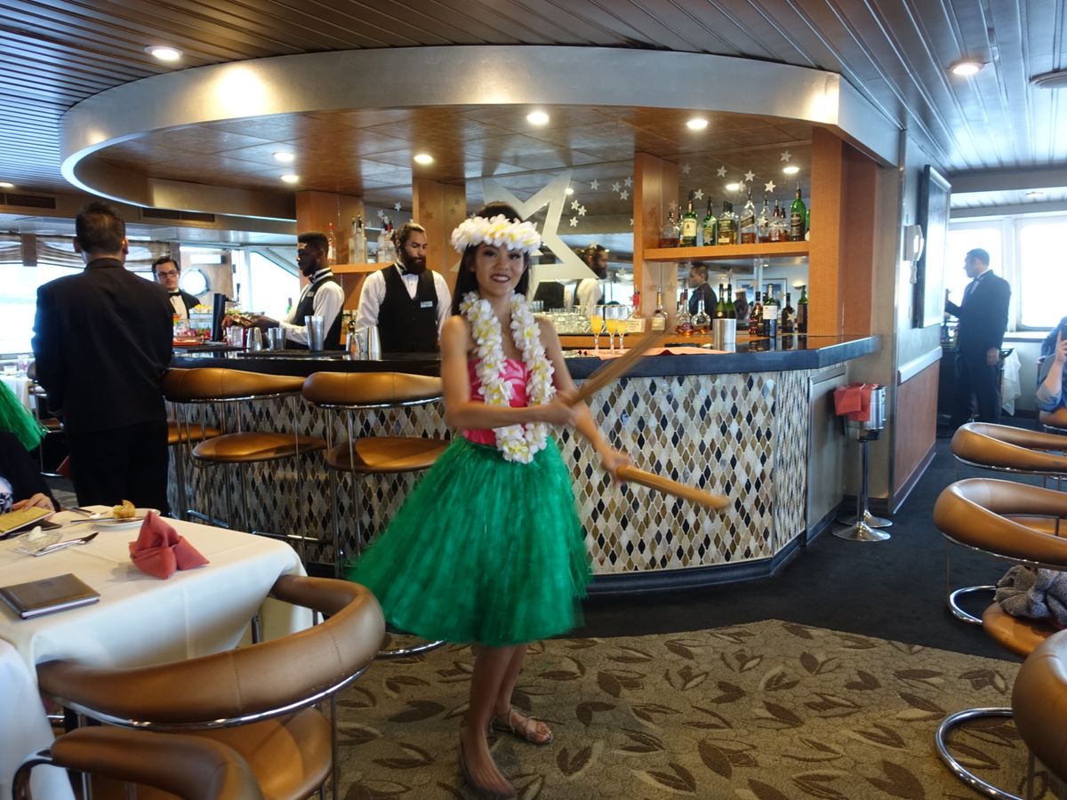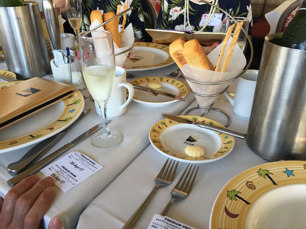 ドリンクはツアー名通り、最初は「マイタイ」(マイタイサーバーからマイタイが出てきます)ですが、何人かはシャンパンをガブガブやっていました。ただ、揺れるので、何に酔っているのかわからなくなります。ソフトドリンクはあまり充実していませんでした。