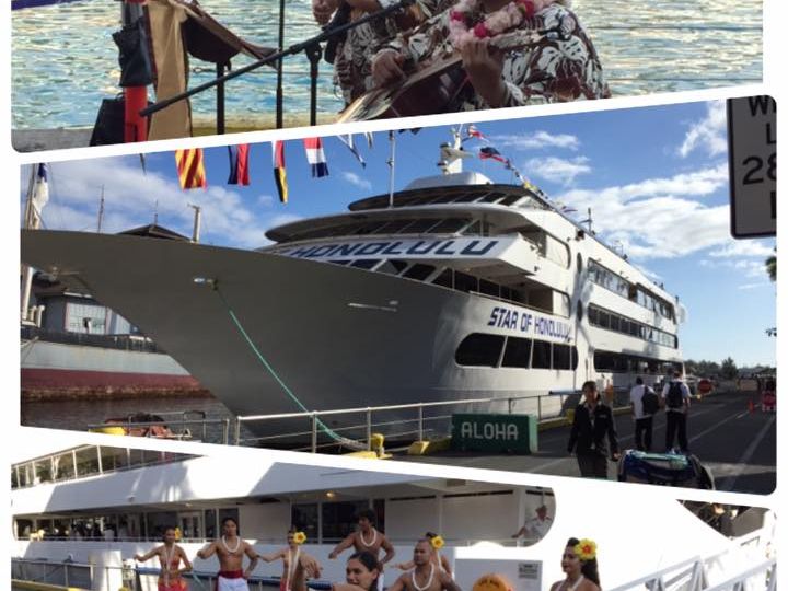 金曜日の夜には、ヒルトンホテルから打ち上げられる花火が海上から見れるということで、金曜日にスターオブホノルルに乗ることにしました。まず、ロブスターとステーキを中心としたコース料理と無料のドリンク2杯、デザートまで大満足でした。その後ショーがあり、花火も見ることができたし、花火の後もスタッフのダンスや盛り上げも満足いくものでした。