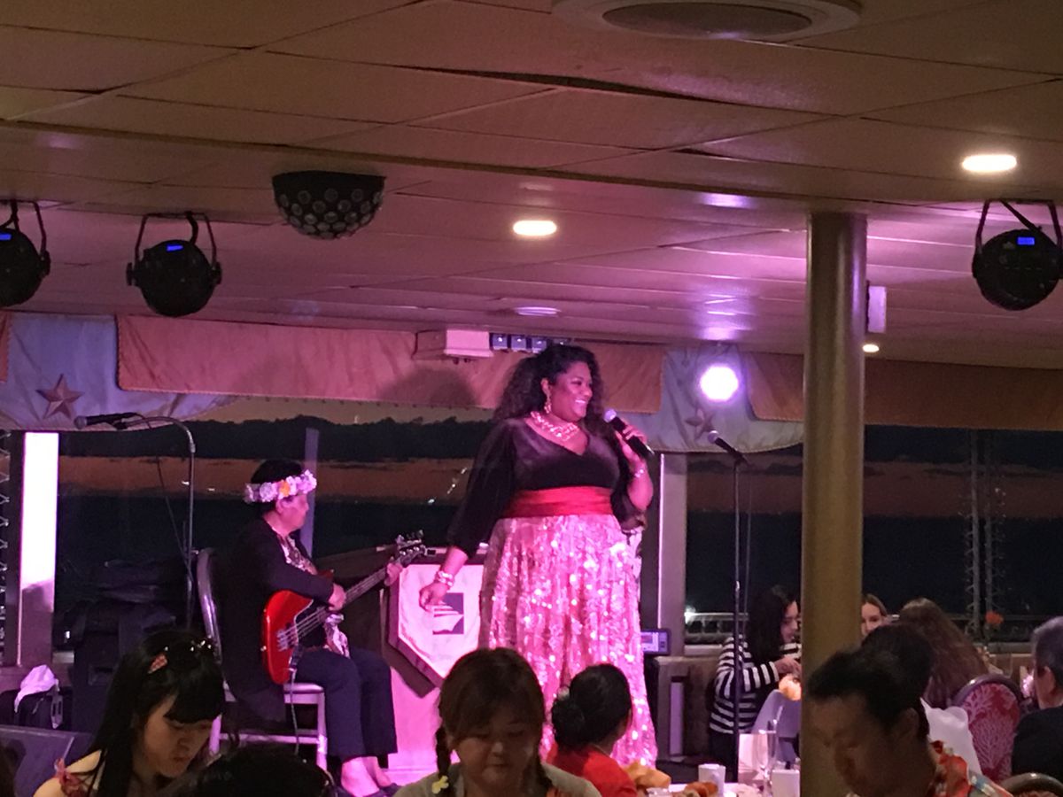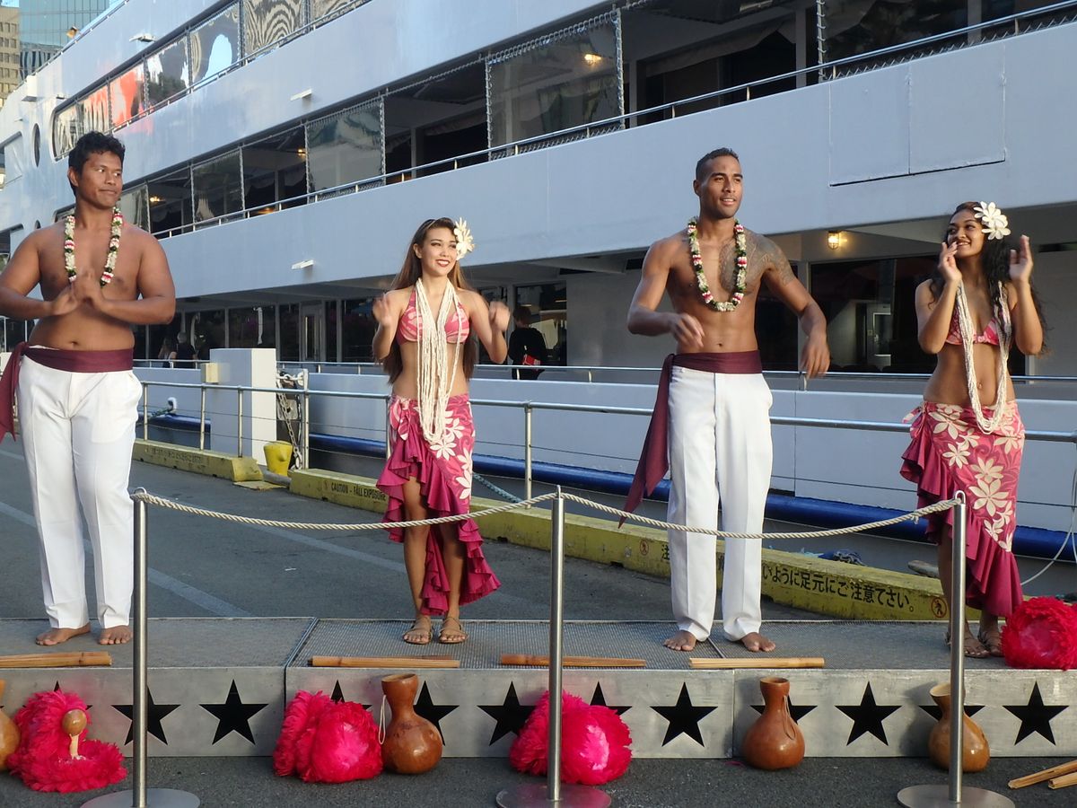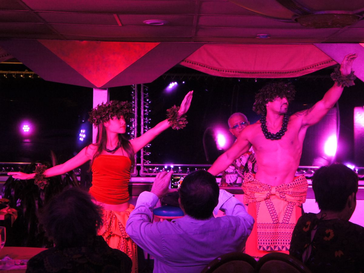 カウントダウンも船だったのに。。。夕日も船からみたいなと、申し込みました。ウェルカムマイタイ《ノンアルコールもあります)や 船にのるときもハワイアンダンスでのお出迎え。食事もその場で切り分けられるローヅとビーフが美味しかった。母はおそうめん風のサラダがお気に入りでした。同じフロアでフランダンスやハワイアン音楽があるのは、別の階のフルコースの階だけなのかなと思っていたのですが、いやいや、ビュッフェの食事のフロアにもいてくださって演奏やハワイアンダンス。ゲストも一緒に参加するダンスタイムもあり楽しくすごしました。夕日もよーく見えました。夜景も楽しめます。デッキにもでやすいので写真もいっぱいとれます。コーヒーもセルフサービスであるしケーキなどもありまーす。母と2人で申込んだので、丸テーブルで別の家族連れの方々と同じ席になりましたが、これまたこのご家族とも楽しく過ごしました。