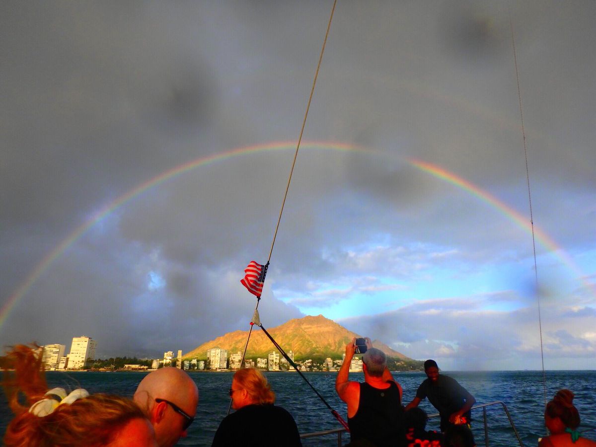 We had everything on our sunset cruise - a sun shower, a beautiful rainbow right over Diamond Head, a magnificent sunset and a full moon. We also had the amazing Dave and Philippe and a great bunch of fellow travellers. The drinks and the fun flowed! We'll definitely recommend this trip to family and friends. We'll be back for another cruise next time we are in Waikiki.