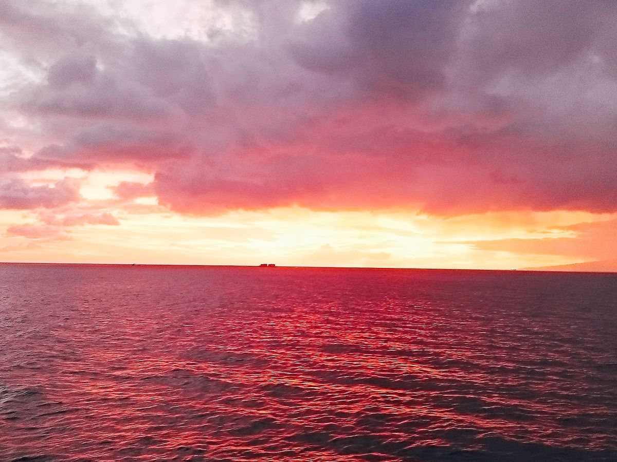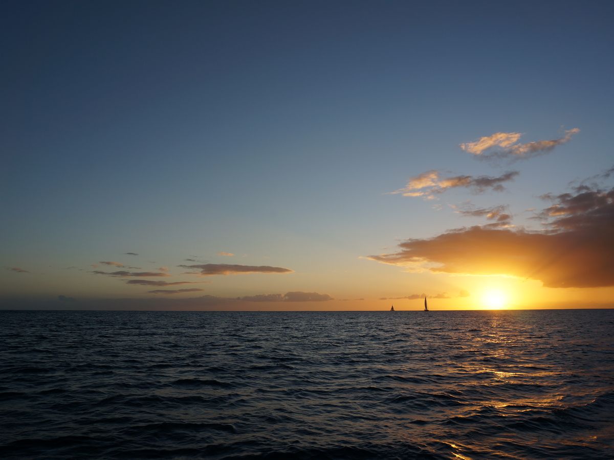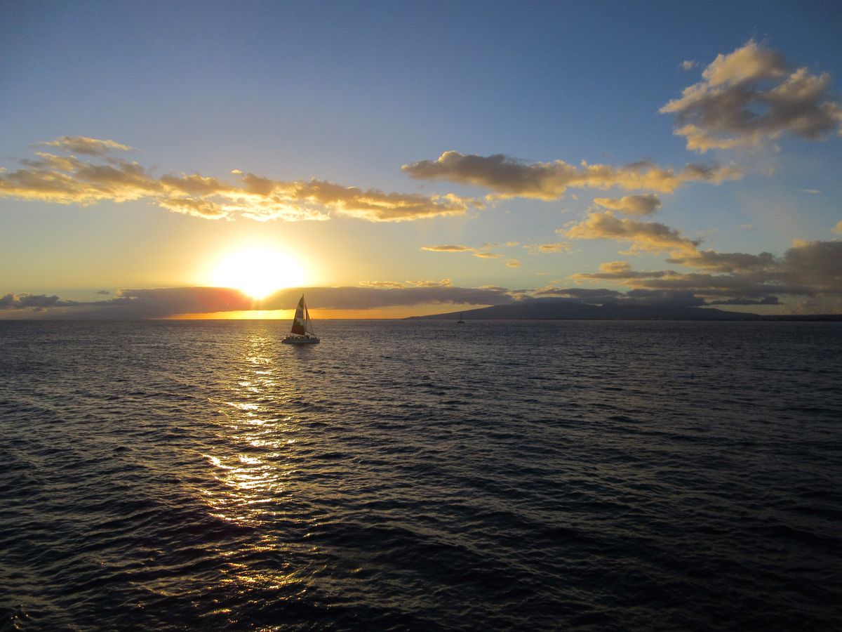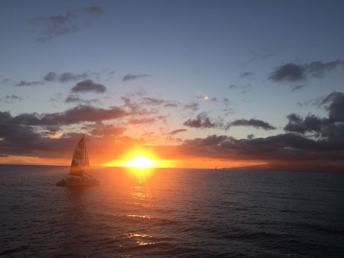 いつもディナークルーズを予約していたのですが、海の風景を見ずにクルージングが終わってしまうことに残念さを感じていました。そんな時にサンセットセーリングを見つけました。新婚旅行、旦那さんは初めてのハワイだし思い切って予約してみました。集合場所が分かりにくい所にあり事前に散歩がてら探しておいてよかったと思いました。シェラトンホテルとハレクラニの間の小道を入ると行けました。それ以外は日本人の参加者は私達を含め2組で他は外人です( *´꒳`* )元々海外に来たら日本人の少ない場所に行くのが好きなので抵抗もなく参加できました。マイタイが飲み放題なのも嬉しいですね!トイレもありますが、狭いと聞いたのでガブ飲みせず、ソフトドリンクも飲みながらサンセットと船の上からの景色を楽しみました。揺れはあります。波が高い時は立ってられないくらい揺れます。外人は立ってわちゃわちゃ動いてましたが、日本人は小柄なので座ってた方がいいですよ。サンセットの時刻には海のベストポジションでブルーの帆をひらいてエンジンを止めて帆だけで進むんです。目の前に広がるサンセット、ダイヤモンドヘッドを独り占め♡素敵なツアーでした。また参加します!