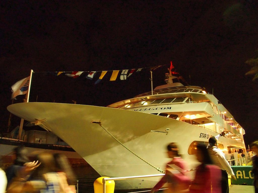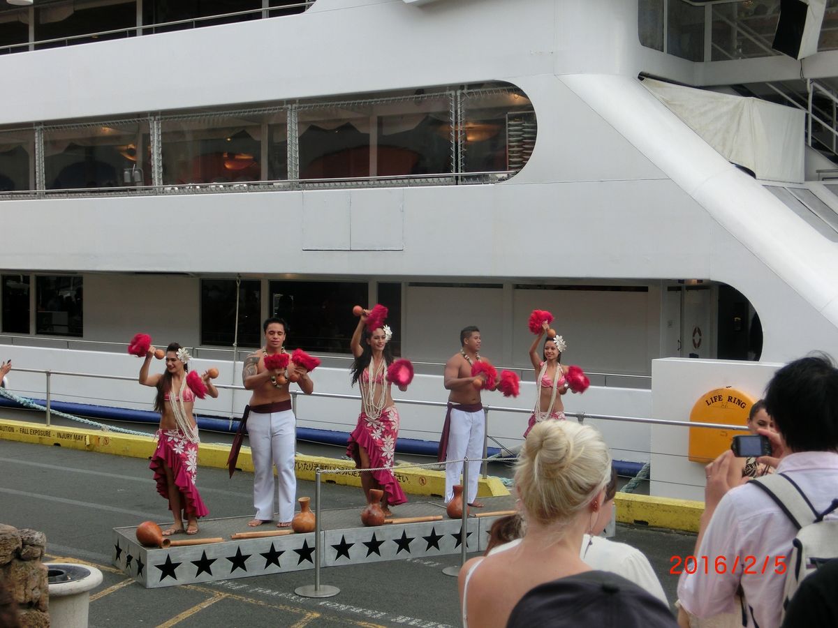 乗船前にフラダンスで出迎えてくれたので、つい写真撮ってたら、早い者勝ちの席だったらしく乗船中のフラダンスのショーを見るのには、見にくい席でした。早く乗船してたらとちょっとがっかりでした。ショー自体は、とても良かったです。ずいぶん前にも同じコースを体験したのですが、もっとゆとりがあったように思いました。今回満席状態でした。外が騒がしいので何事かと思ったら、クジラが見えたようです。夕方だったのですが、潮吹きとジャンプの胴体部分が見えました。前日わざわざ朝からホエールウオッチングに乗船したよりましでした。早めにカニのお代わりは言わないとだめだなと思いました。他のことに気を取られすぎてタイミング逃しました。夕日やワイキキのとってもきれいな夜景最高でした。