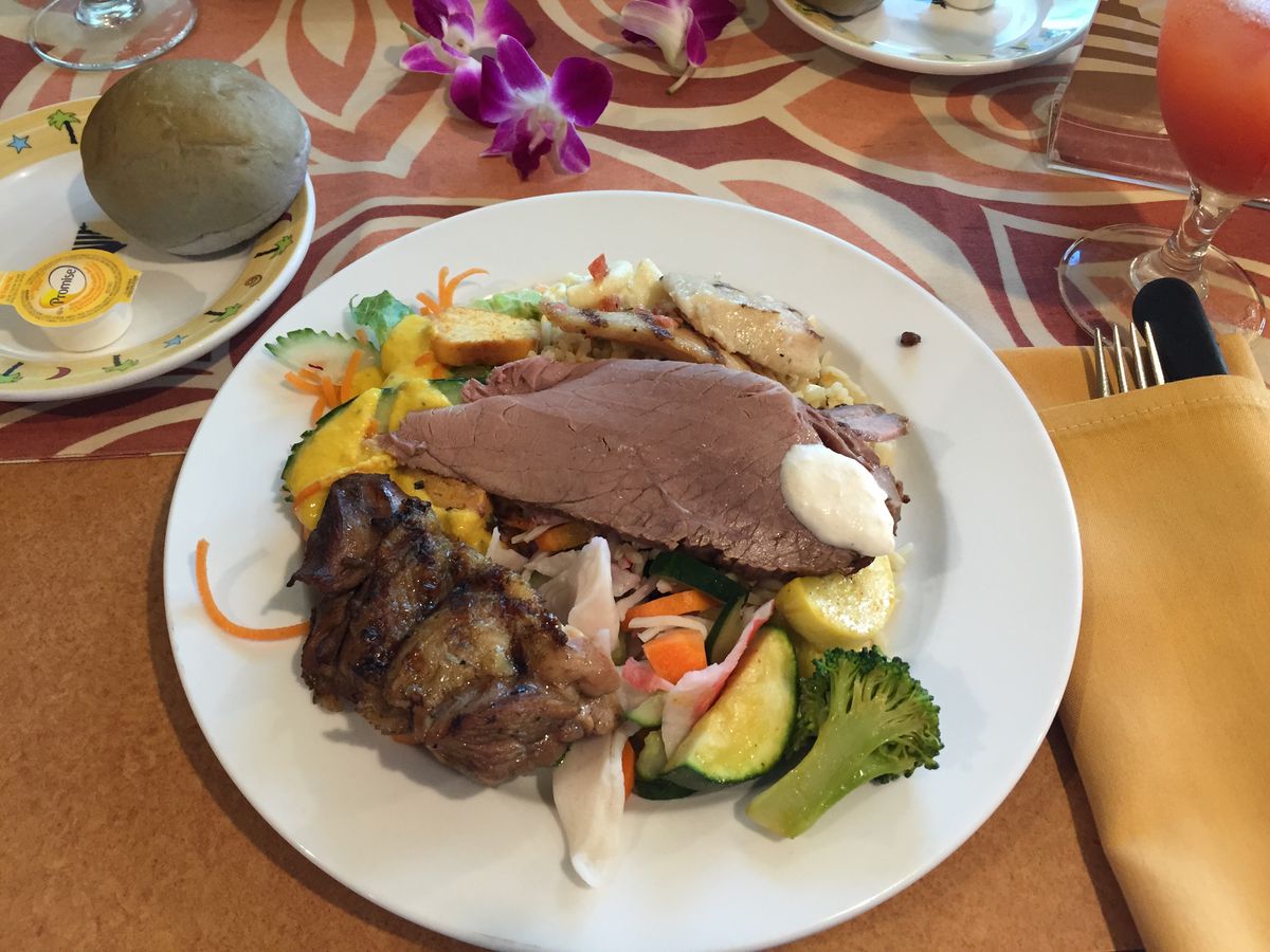 最初のドリンクサービスはバーテンダーが一人だけだったため少し遅かったですが、最初のラウンドの後はかなりスムーズに進みました。食事は旅行の30〜45分後に出てきて、とても美味しいビュッフェスタイルで、ハワイのほとんどのアジア系ビュッフェと似た料理でした。