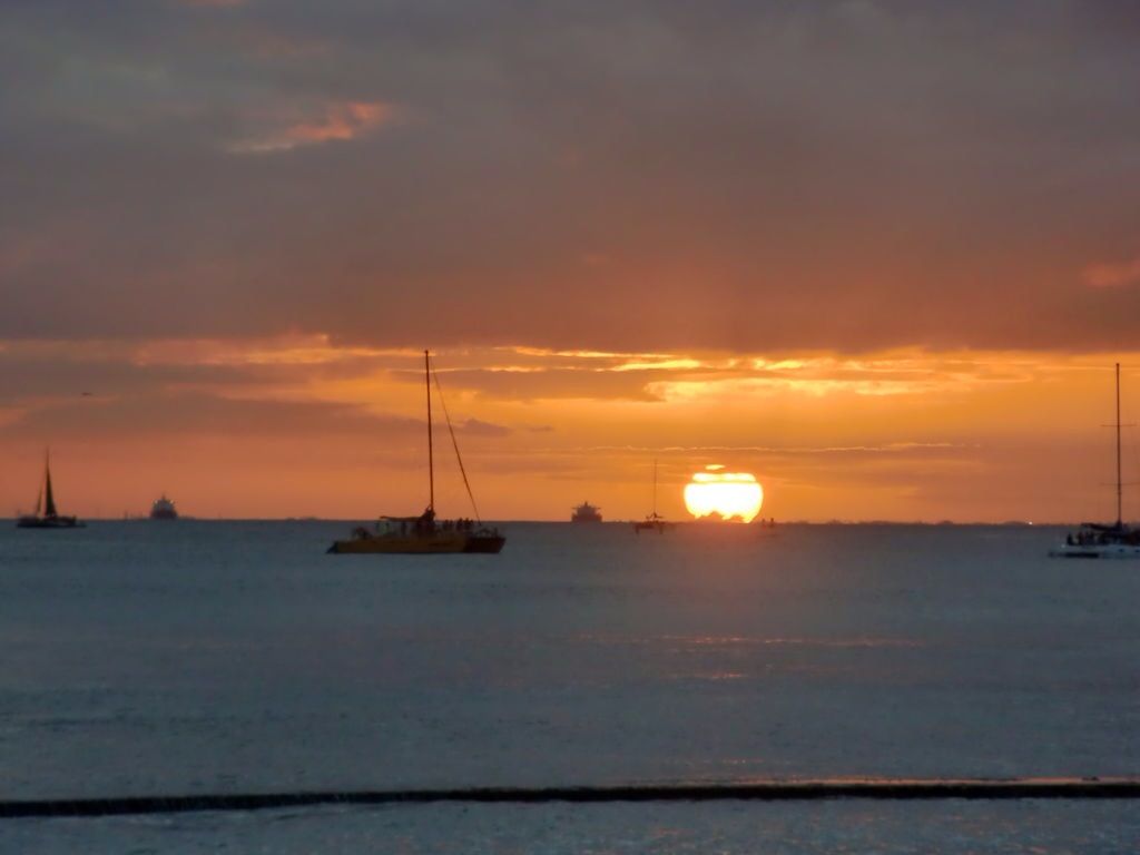 ワイキキ沖から素晴らしい夕陽を見ながらマイタイを飲む。