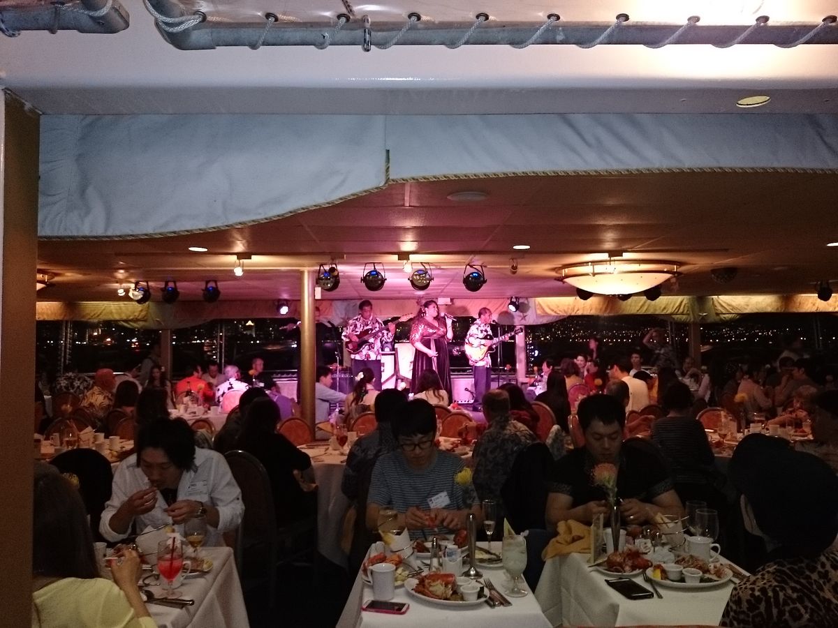 初めに、ハワイアンフラダンスで、お出迎え。船内に、案内後マイタイのドリンクサービス。食事と、夕日、ハワイアンフラダンス、夜景、最後は、皆で、一緒にダンス。楽しかったでs