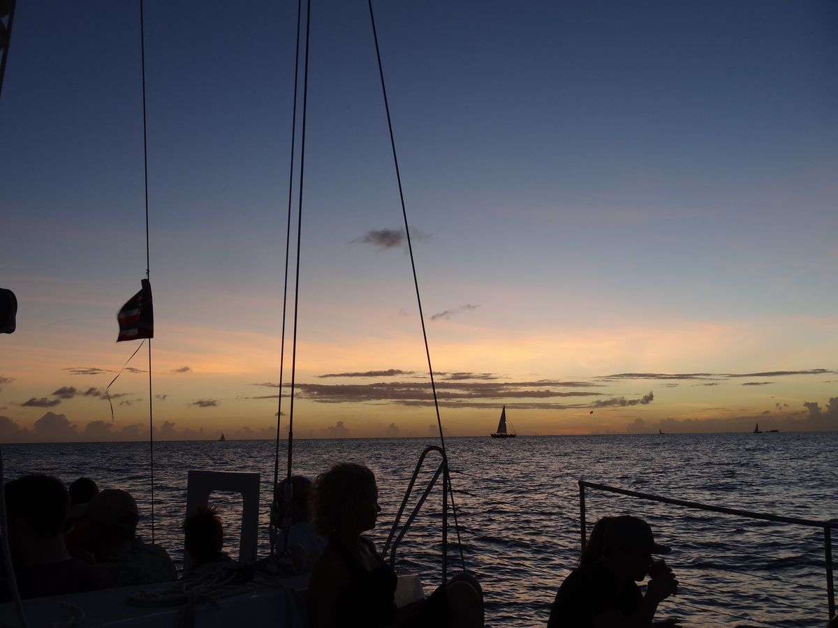 集合場所がちょっと分かりにくかったですね。時間になるとたくさん並んでいましたが日本の方は少なかったです。乗り始めると英語でどんどん話してますが、なんとなく雰囲気でイェーって感じ。マイタイ、ビール、ワインなど飲み放題で、マイタイを頂きました。飲み放題ですがおかわりの時、外国の方(殆ど)さりげなくチップを渡してましたよ、なるほどスマートな飲み方だと思いました。夕日も、海から見えるワイキキビーチも素晴らしかったです。次に行くことがあったら、また参加したいと思ってます。あと、乗る前に写真を撮り、下船の時買う人は15㌦でした。