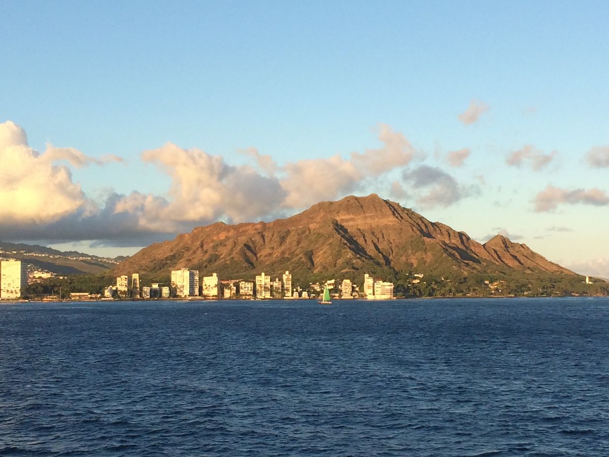 船から見るワイキキビーチ、ダイアモンドヘッド、夕陽はすごくきれいでした。お食事は可もなく不可もなく、という感じでした。最後のケーキが甘すぎず美味しかったです。