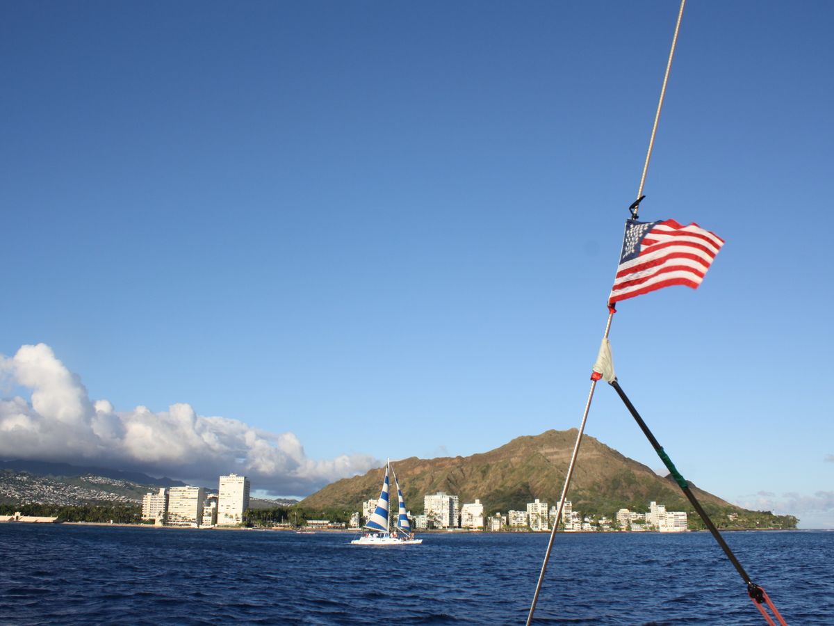 ワイキキビーチ、ダイヤモンドヘッドを海から眺め、波と風を感じながらマイタイって最高です。サンダルとバッグは船の収納ボックスに入れ、裸足で乗り込みます。