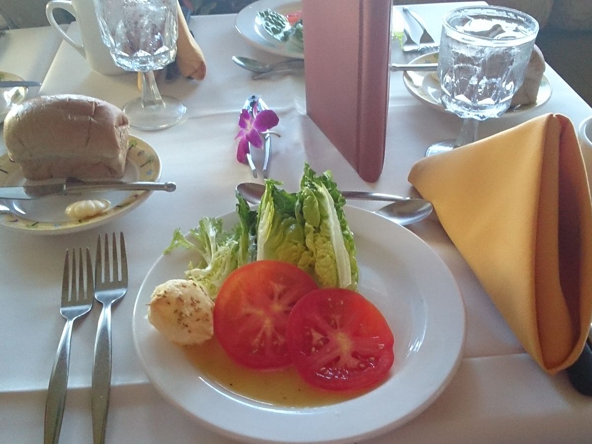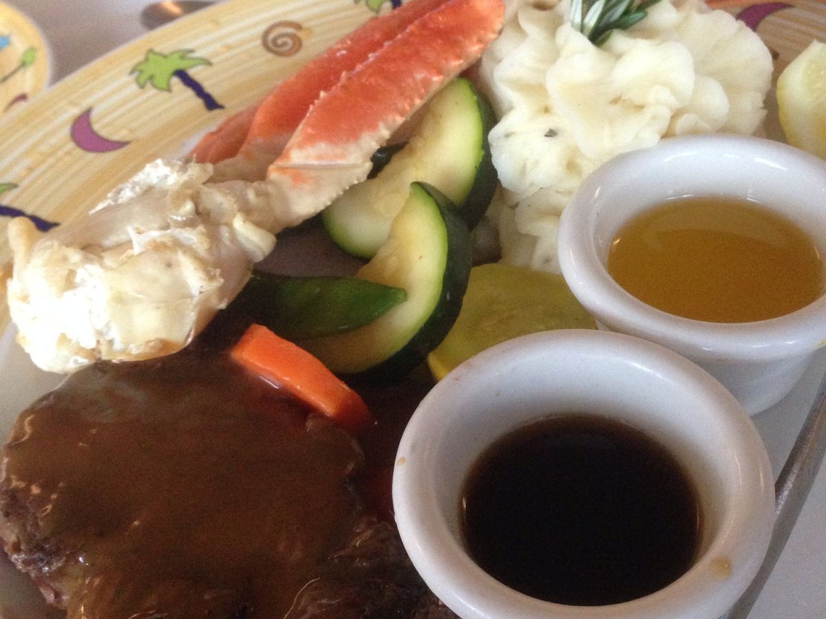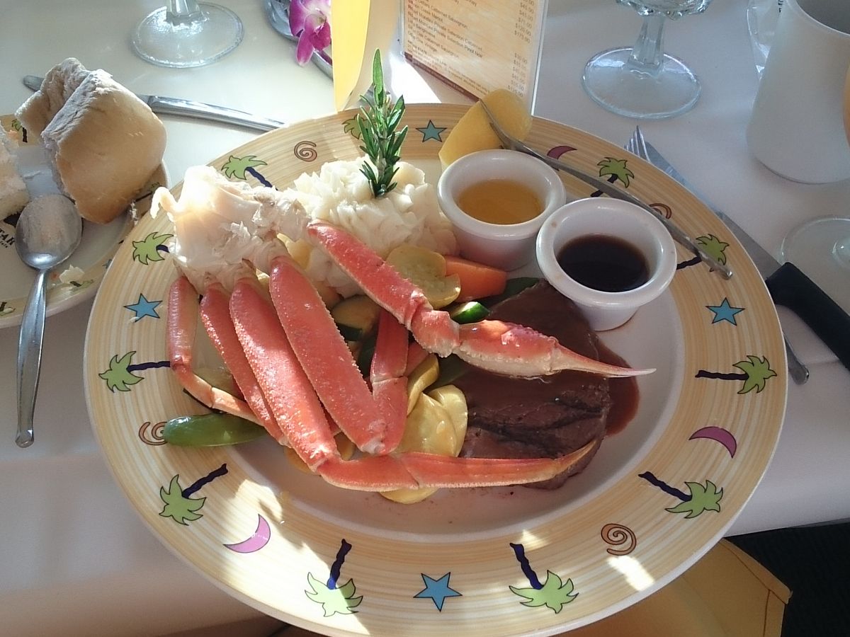 チェックイン時間が16:45とのことで、16:20くらいに到着しチェックインしました。ただ、乗船してからもツアー客を中心にダラダラと乗船してくるので、40分は船の中で待ちました。食事はワンスターですので期待はしていませんでしたが、ステーキは美味しかったです。カニは、、、。