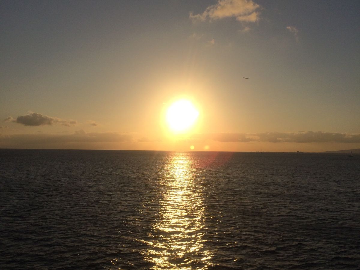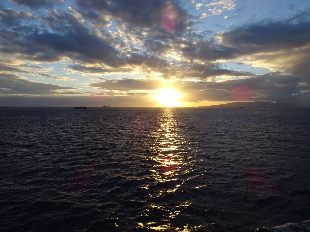 主人がハワイへの家族旅行を企画してくれ、初めてハワイに行きました。第1日目のサプライズで準備してくれたのがディナークルーズです。これもまた、初めての体験でメチャメチャテンションが上がりました。テーブル担当のお兄さんがすごく笑顔が素敵で優しくてお料理も最高でした‼︎とにかく景色が素敵で夕日が水平線に沈む瞬間をスマホで撮りました