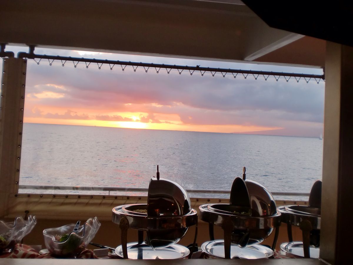 船はあまり好きではないのですが、母の希望で参加しました。大きな船ですが、船なのでそれなりに揺れますが、楽しめました。食事もまずます、エンターテインメントもなかなか楽しかったです。デッキからの夕日、ホノルルの夜景が素敵でした。金曜なので、花火も期待しましたが、これは角度と時間が合わず、見れませんでした。残念。