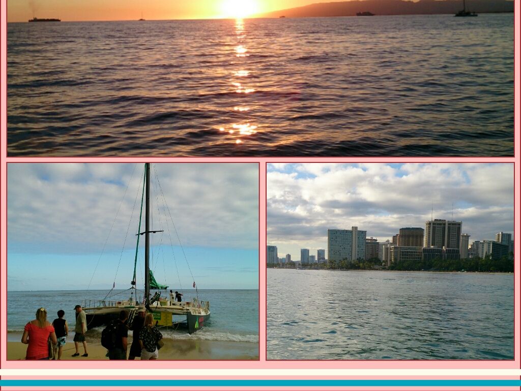 ヨットから眺めるワイキキはとてもきれいで、海は雨ではありませんがワイキキのあちこちで雨が降っていたのか虹が2本くらい出ていました。