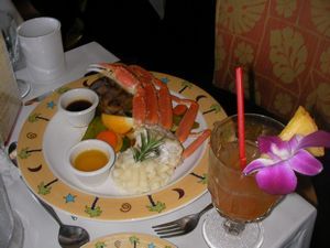 食事はサラダ、パンが出て、メインで お肉、かに、ポテト。最後にデザートでアイスがでました。大変美味しく、量もちょうど良く、食事は大変満足の行くコースでした。個人差はあると思いますが、女性でもちょうど良い量の料理だと思います。スタッフの対応、料理を運んでくるタイミングも良。サンセットは天気が悪かったですが、何とか見ることができました。食事に気をとられていて、危うく見逃すことでした。(これから行かれる方はタイミングには要注意!!)サンセットが終わり、船上ではいろいろなパフォーマンスがあり、みんなで参加でき大変盛り上がれました。船上からの夜景はとてもきれいでした。事前に記念日ということを伝えていたので写真をサービスしてくれました。集合場所までのアクセスは、行きはトローリーバスを利用すれば行けますが、帰りのトローリーバスは旅行会社等にもよりますが、運行していないので要注意。行きは時間に余裕をもって行って下さい。夕方の時間帯なので、渋滞にかかる可能性があります。アラモアナからタクシーを利用して行きましたが、渋滞にかかりました。(※アラモアナからチップ込みで$20)私たちは帰りはバスを利用しました。(※2人でチップ込$5~6)