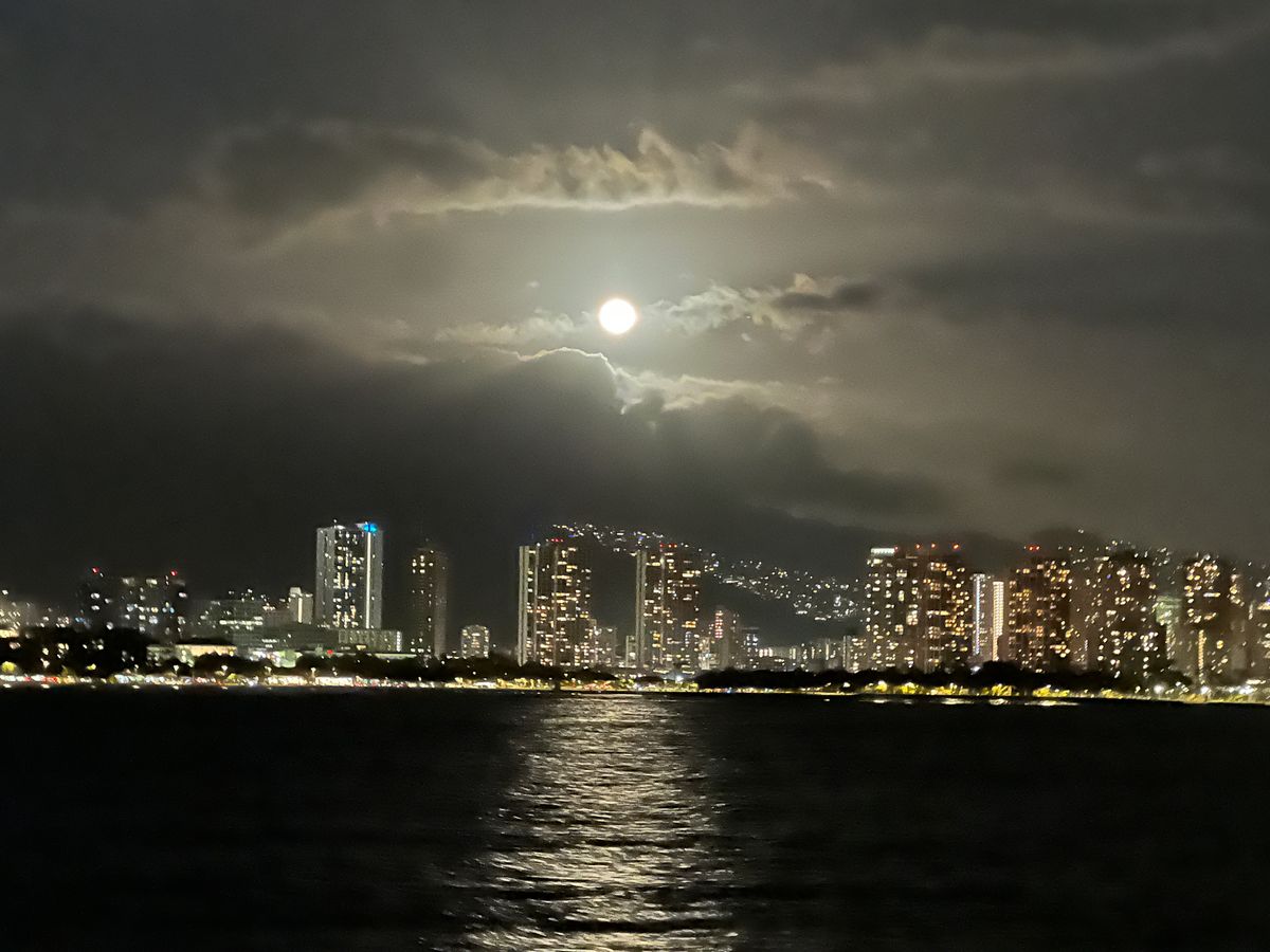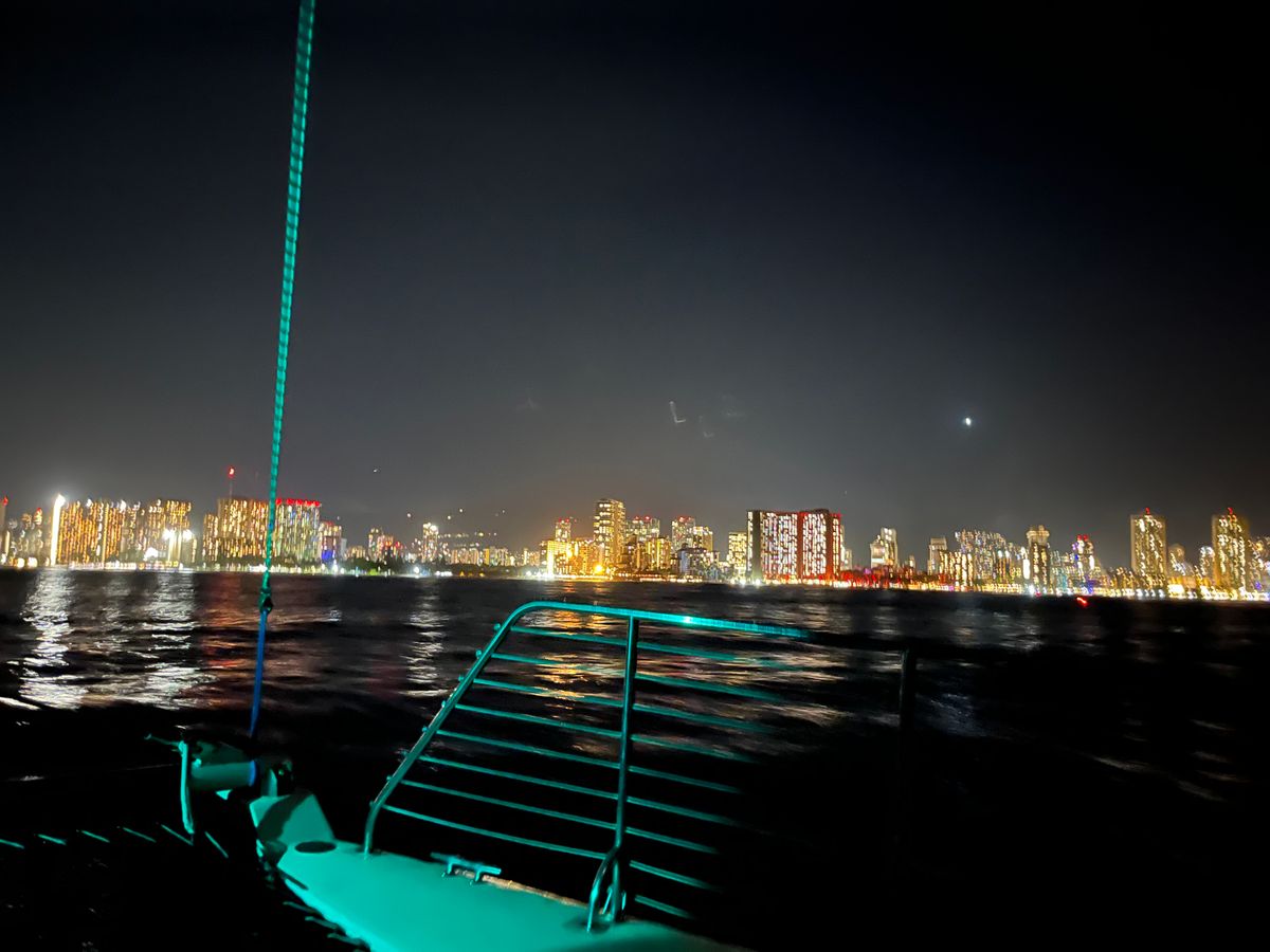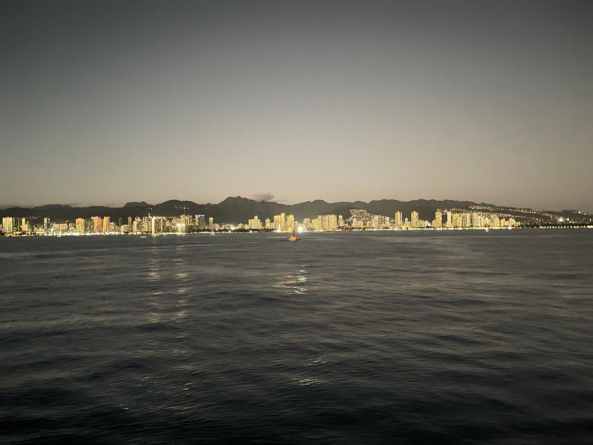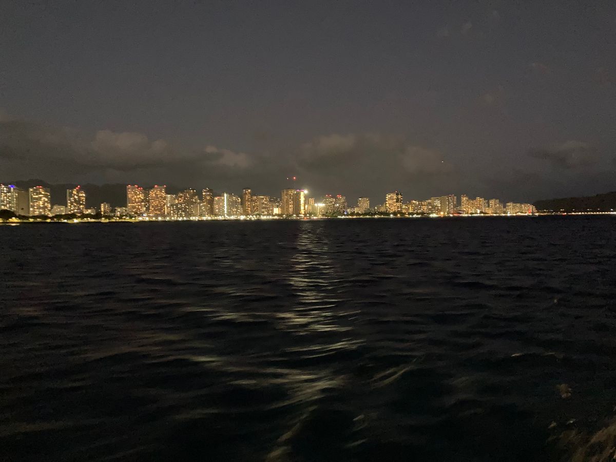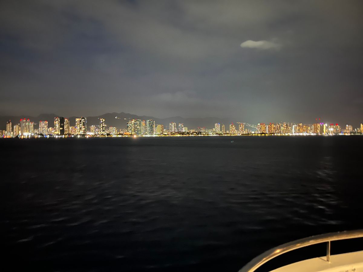 若干曇っていたのでサンセットは無理でしたが、海上から見るホノルルは摩天楼のごとき輝いていました。