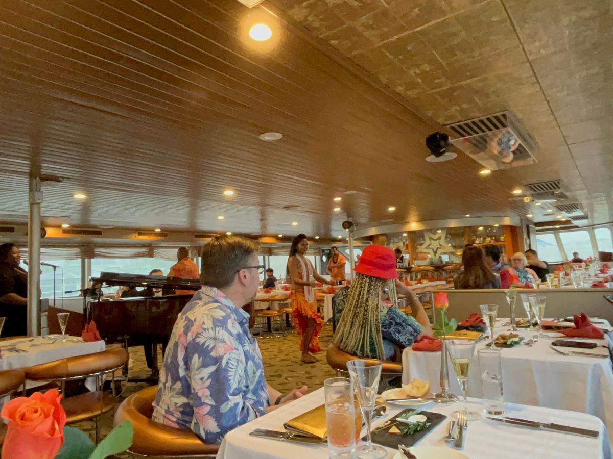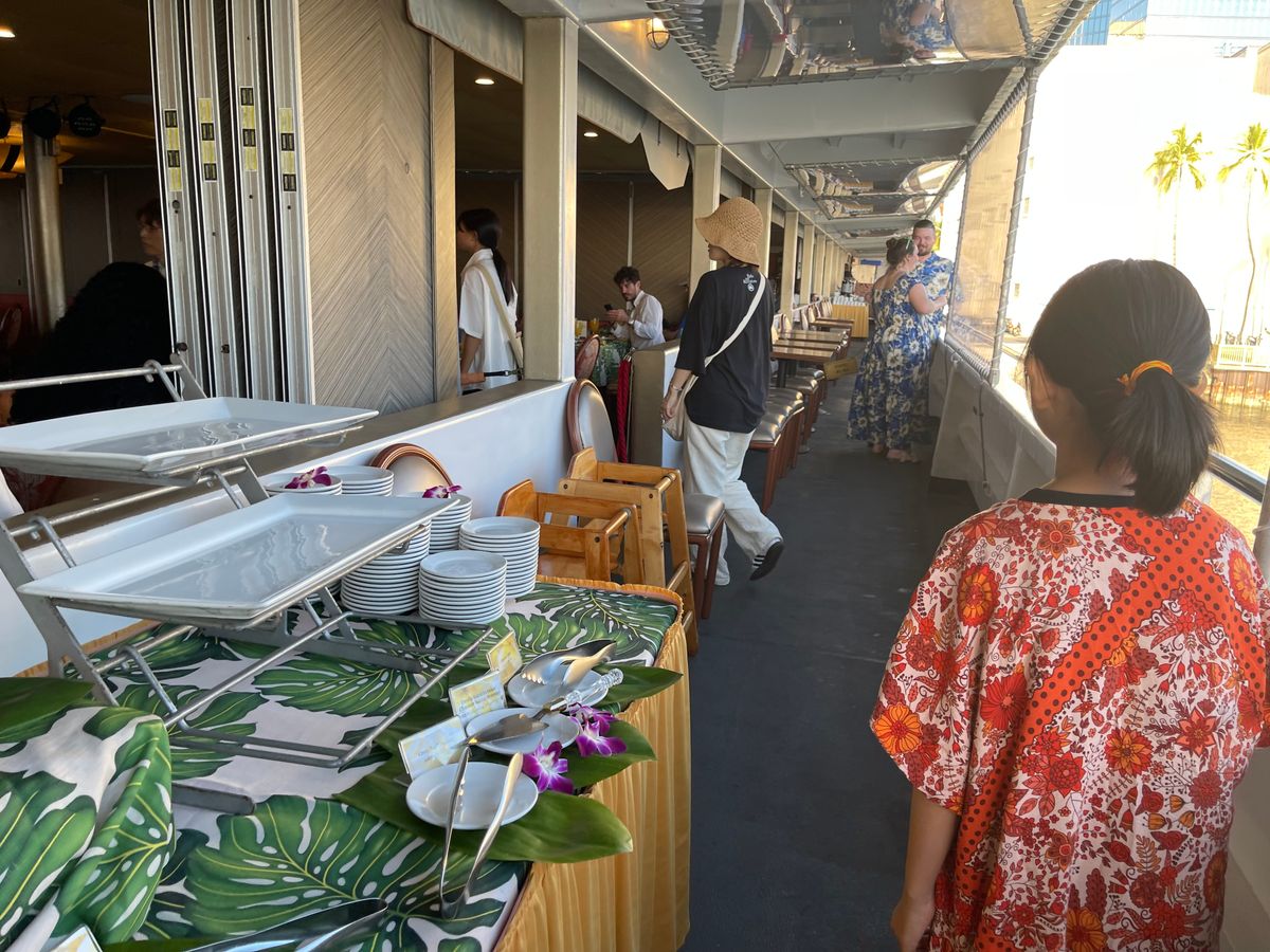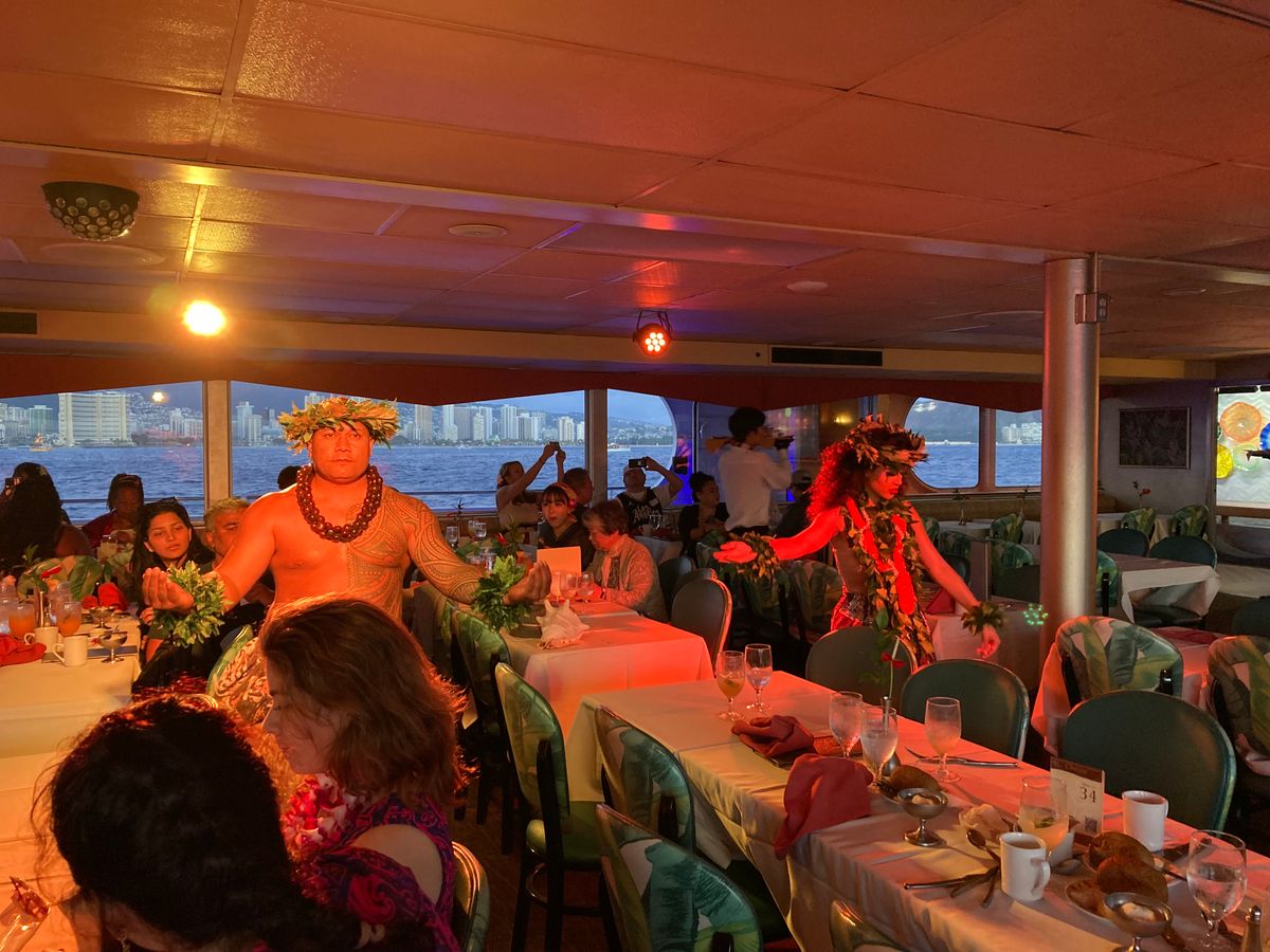 出航したら、キャプテンの乾杯の挨拶、ダンサーによるフラを見ることができます!しばらく食事を楽しんで、本来ならサンセットを外で見ることができたのかもしれませんが、当日は雨の為見ることは出来ませんでした。ただその分ゆっくり食事をして、後半にはジャズを聴きながら楽しむことができました!雨と強風のせいかわかりませんが少し船は揺れてました(・・;)船酔いする方は気をつけた方がいいかもしれません!お手洗いはとても広く綺麗でした!