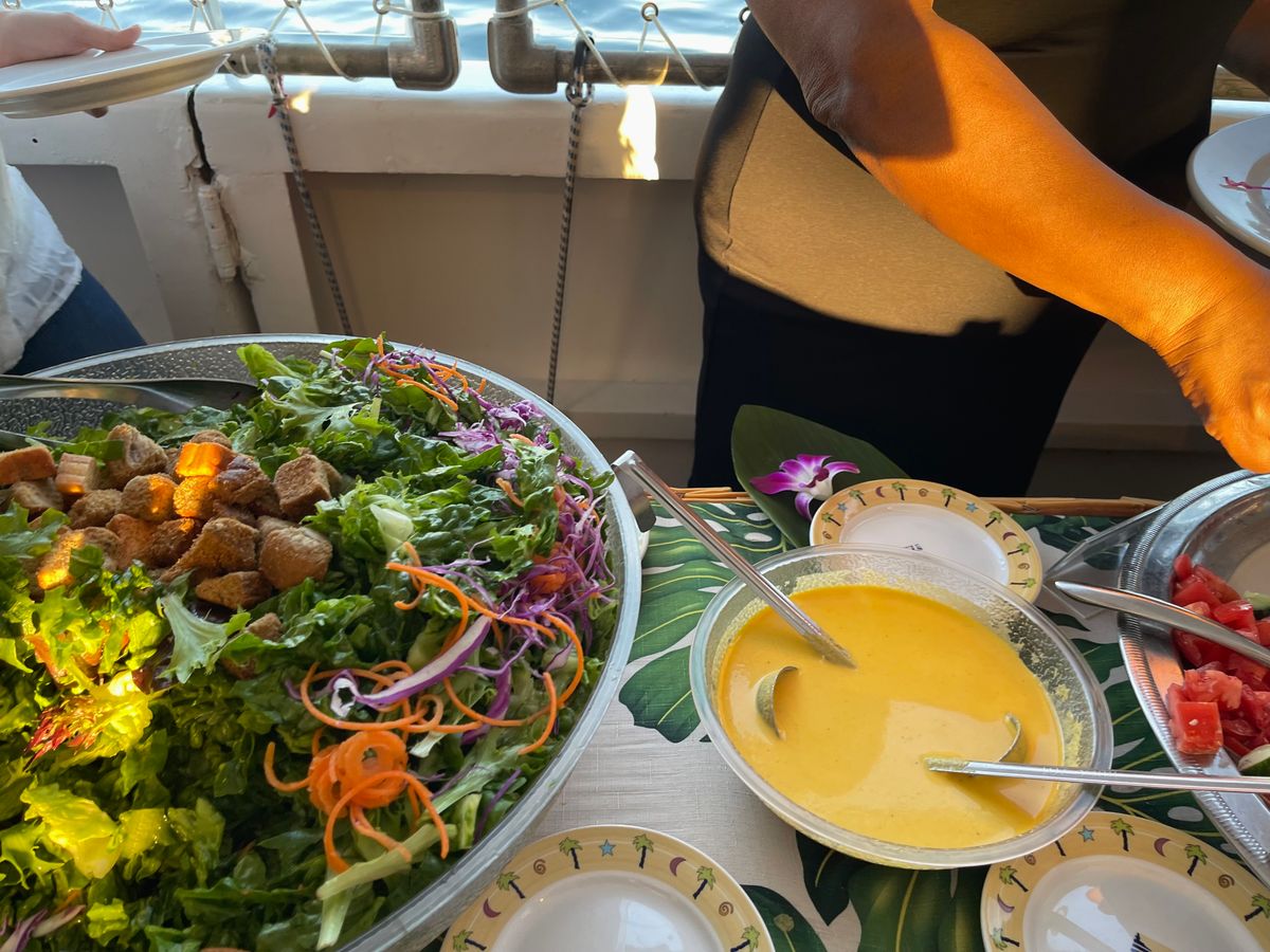 食事の合間にはボートを探索する機会もありました。ワイキキやダイヤモンドヘッド、他のボートの素晴らしい景色を楽しむことができました。雲が多かったですが、それでもとても楽しかったです。そして、クジラを見ることができたのは運が良かったです!それが最高の瞬間でした。