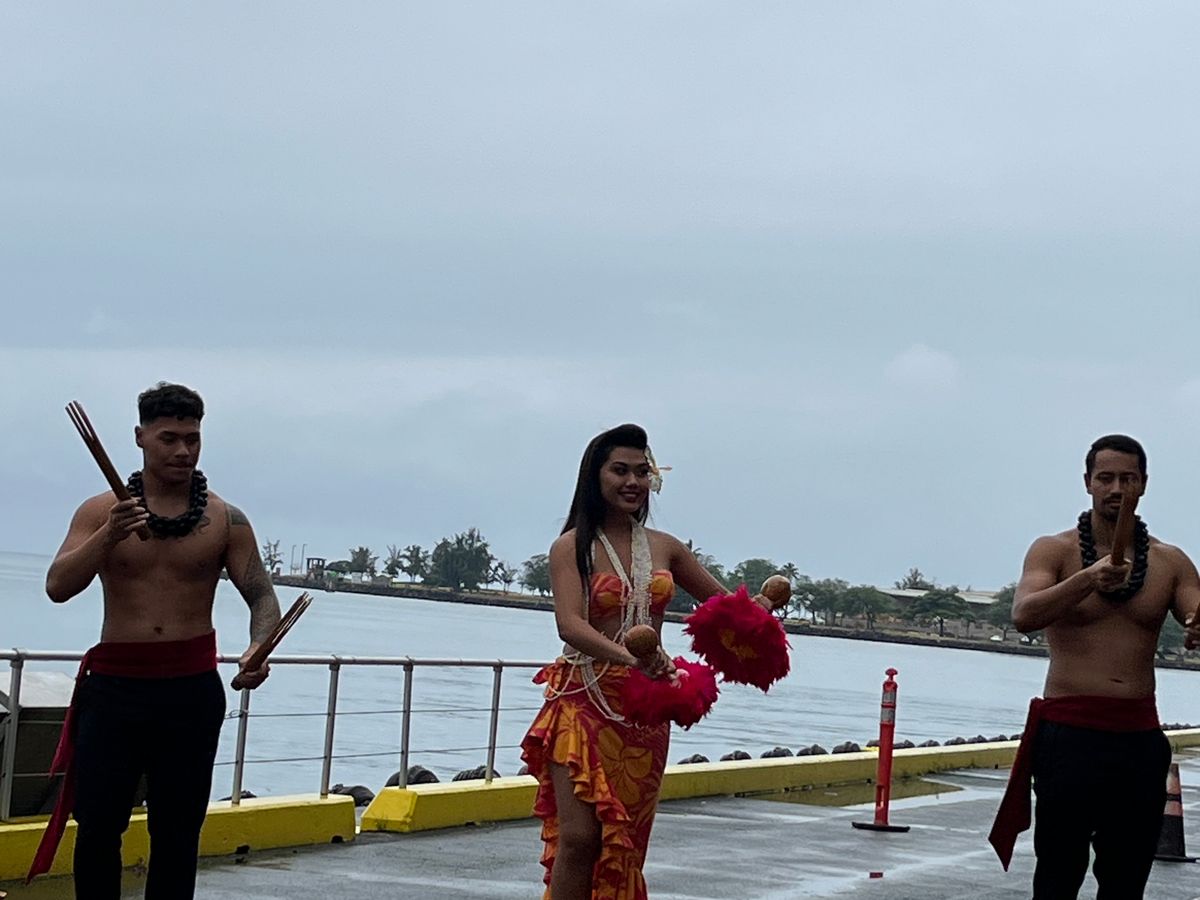 チェックイン時間より船の前でフラダンスのショーを見ることができました。