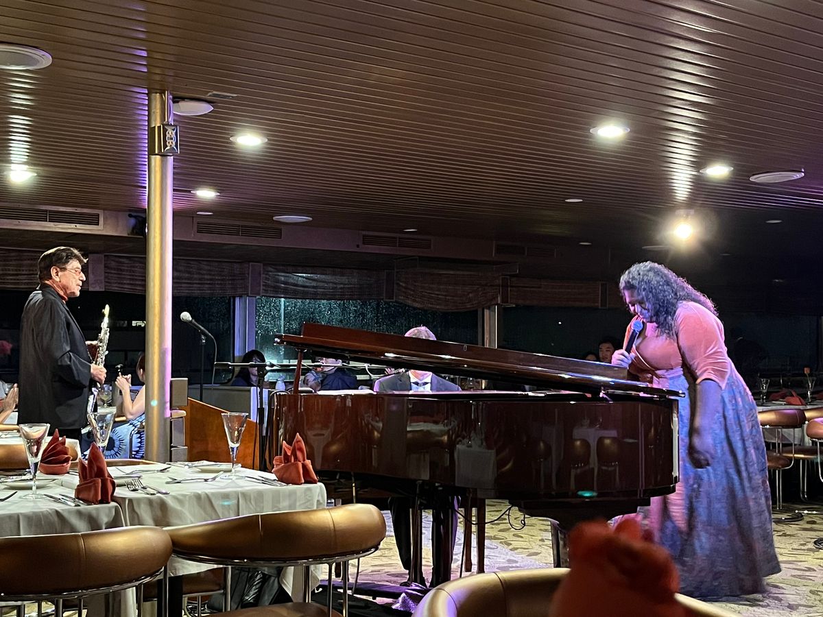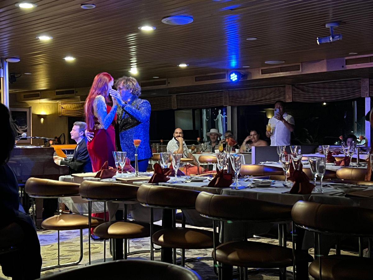 さらに、ライブエンターテイメント(ピアニスト、サックス奏者、歌手)があり、すべて素晴らしかったです。写真も撮ってくれるので、30ドルで購入できます。最後には、特別な occasion のある人たちが部屋の真ん中で踊るように促され、非常にロマンチックでした。