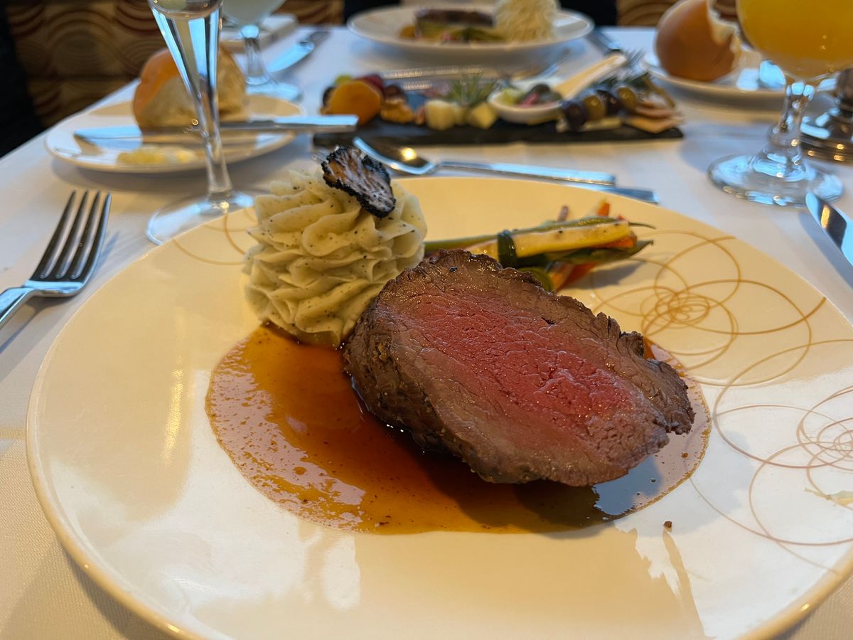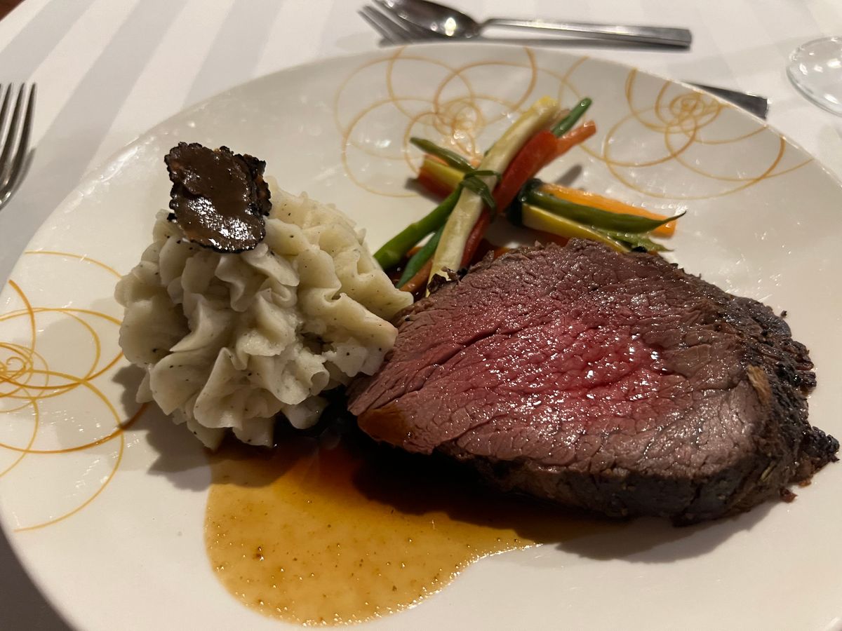 厚切りローストビーフにトリュフ入りマッシュポテト、チーズケーキとコーヒーでした。