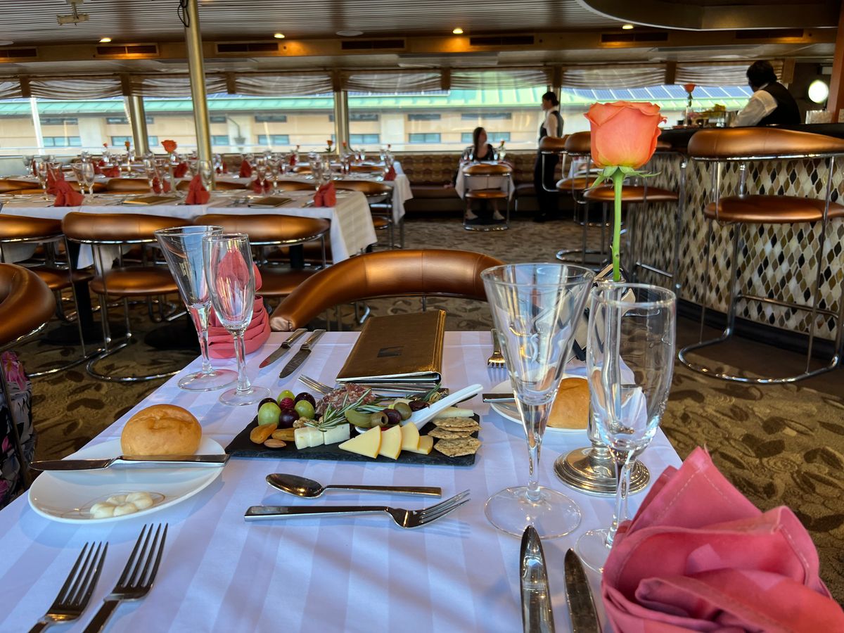 The event began on time with a glass of champagne. I must admit that the food was better than expected. The staff waited to serve each course until we were at the table, as we often went out to take air between courses and take pictures. Would recommend to anyone looking for a short dinner cruise with romantic/relaxing ambiance.