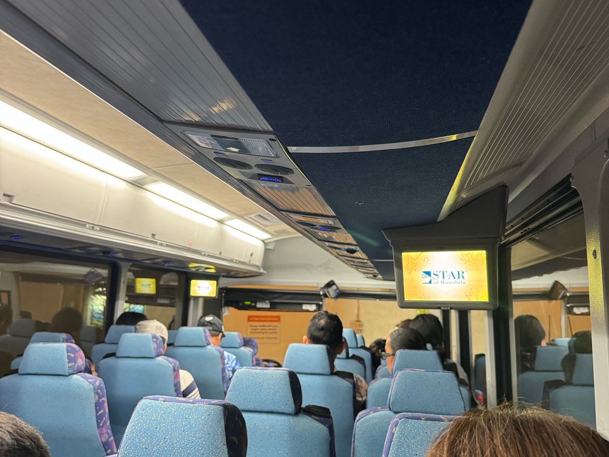 事前予約の指定場所、ヒルトンのアイランダー車寄せに集合し予定の15分前にはプラカードをお持ちのスタッフさんがいらっしゃいました。各自シールを貰いバッグや洋服に貼ります。大変わかりやすい流れで、5組ほどご一緒に大型バスへ。15分ほどでアロハタワーの辺りに到着しウェルカムホノルル号の中へ。あとはシールの番号を誘導スタッフさん方々が見て流れのままにテーブル席へ。