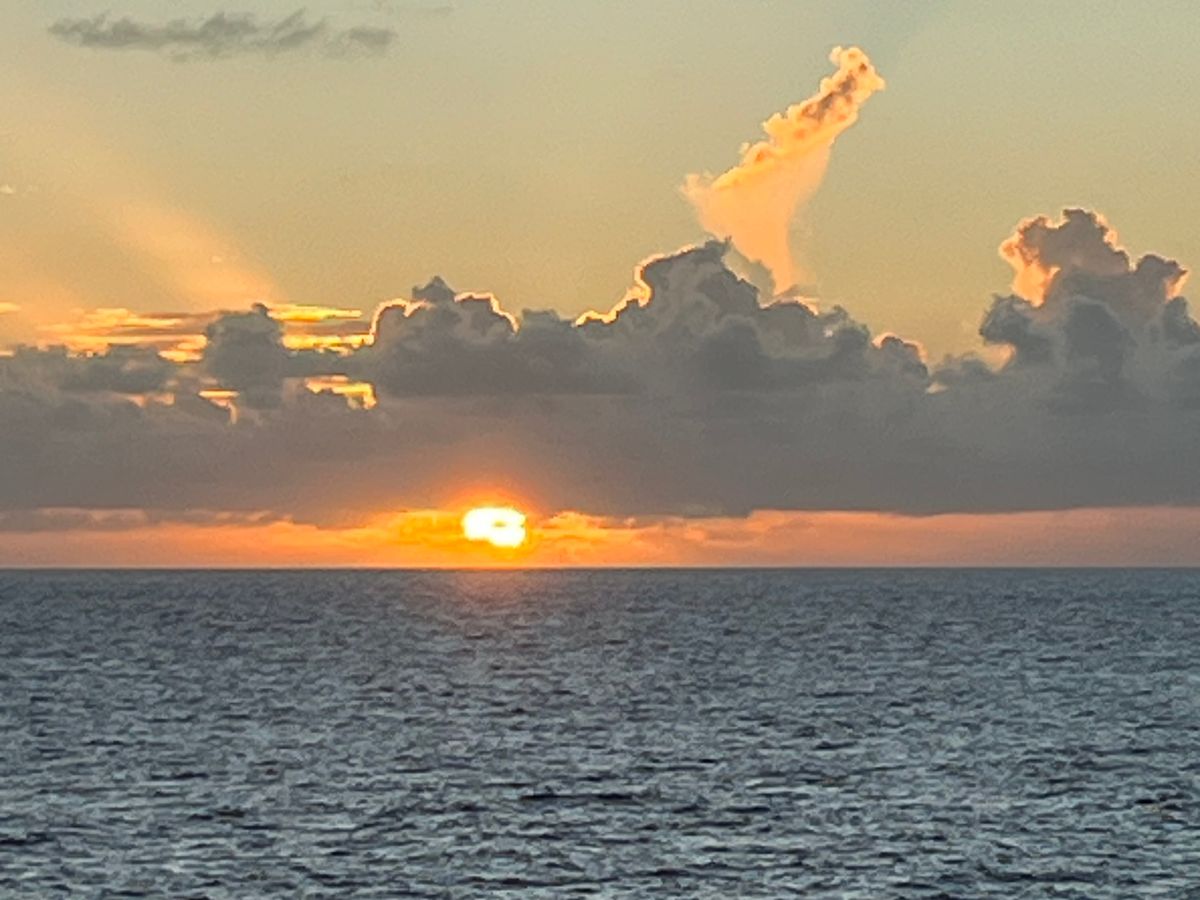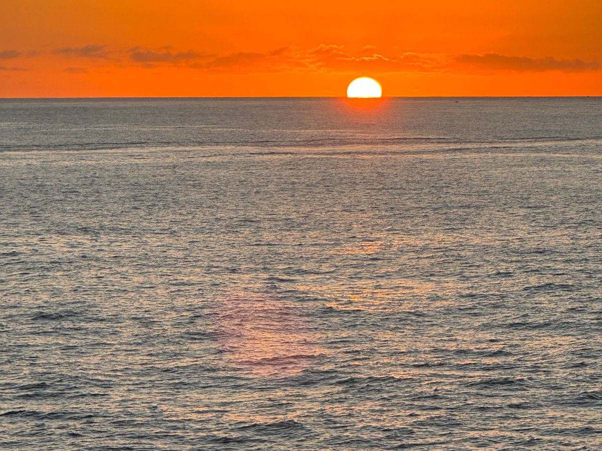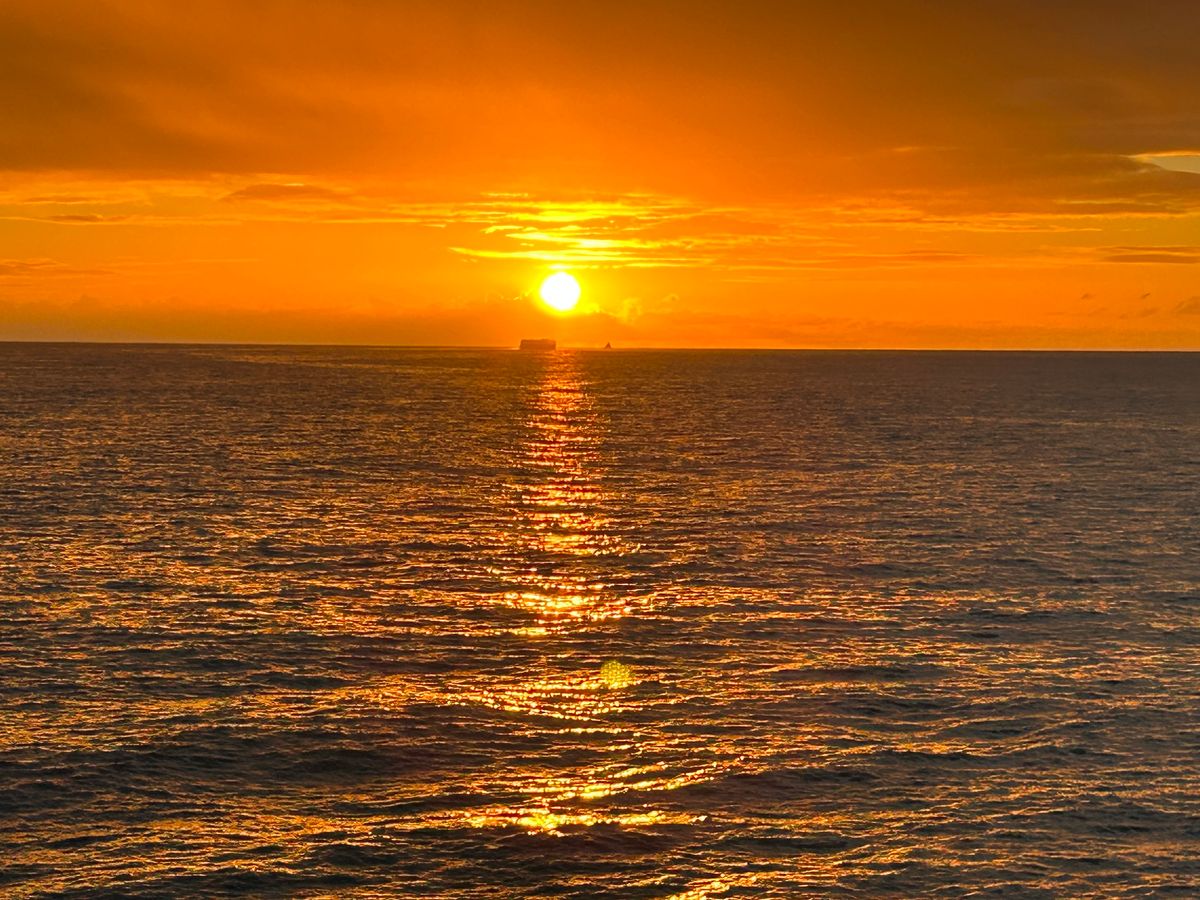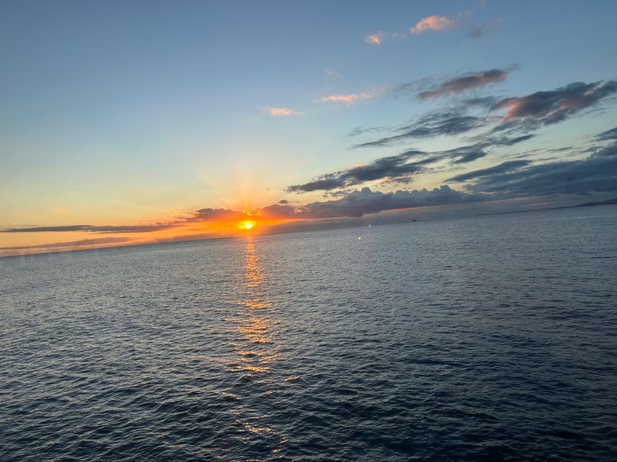 当日は曇り予報でしたが、割と雨が降り、サンセットは諦めて居ました。しかし、夕陽が沈む10分間だけ雲と海に切れ間ができ、沈む夕陽を見る事が出来ました♪